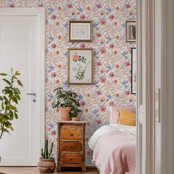 Ταπετσαρία Κολίβρια ανάμεσα σε μεγάλα λουλούδια σε ροζ και μπλε αποχρώσεις Nr. a00733