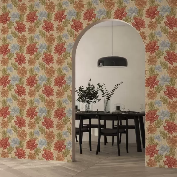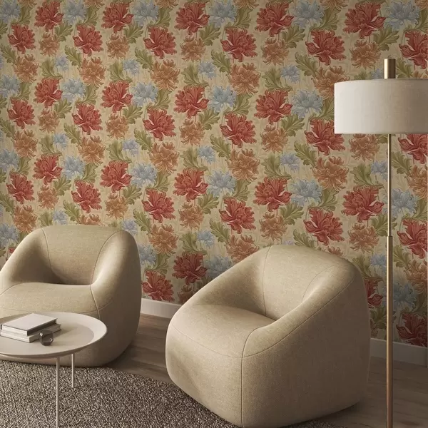 Ταπετσαρία Μεγάλα χρυσάνθεμα σε ζεστές αποχρώσεις σε μπεζ φόντο Nr. a00743