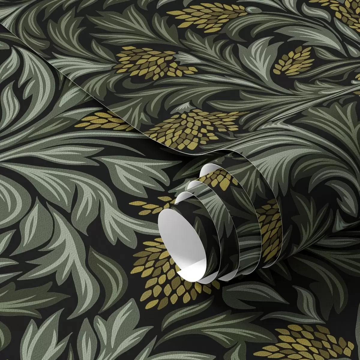 Ταπετσαρία Σκούρα φύλλα άκανθας με κίτρινους κώνους σε μαύρο φόντο Nr. a00745