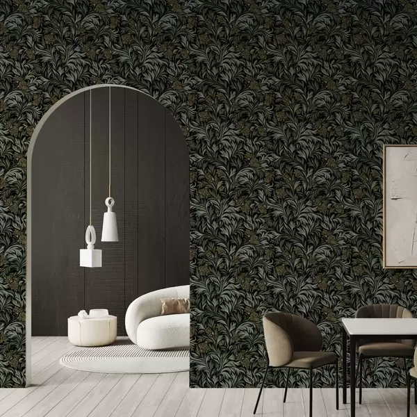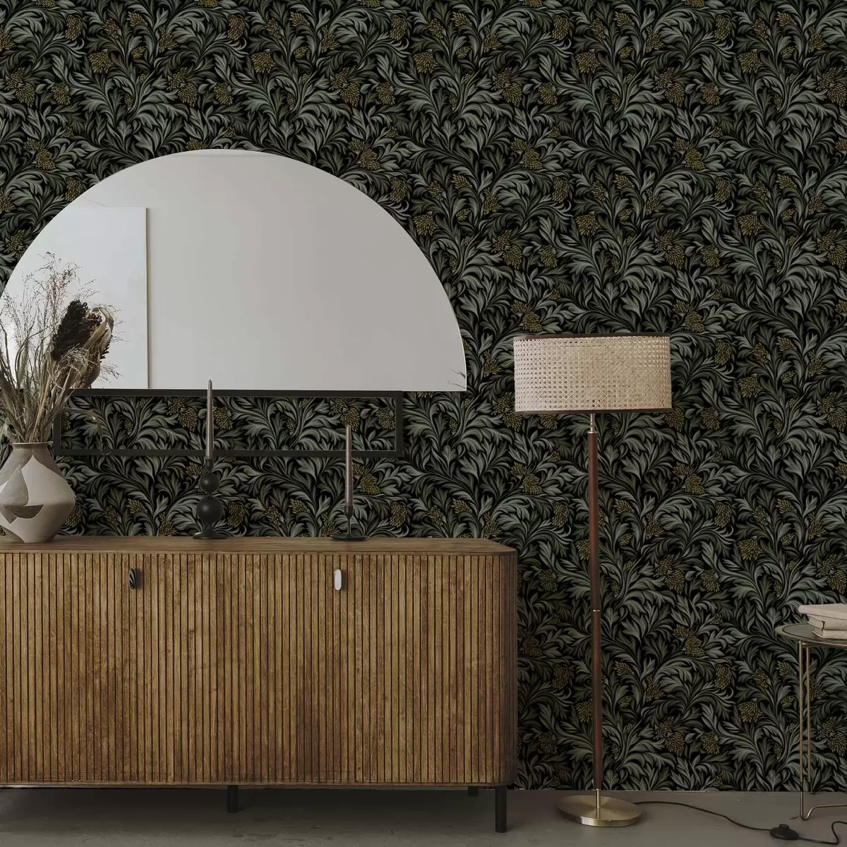 Ταπετσαρία Σκούρα φύλλα άκανθας με χρυσούς κώνους σε μαύρο φόντο Nr. a00745