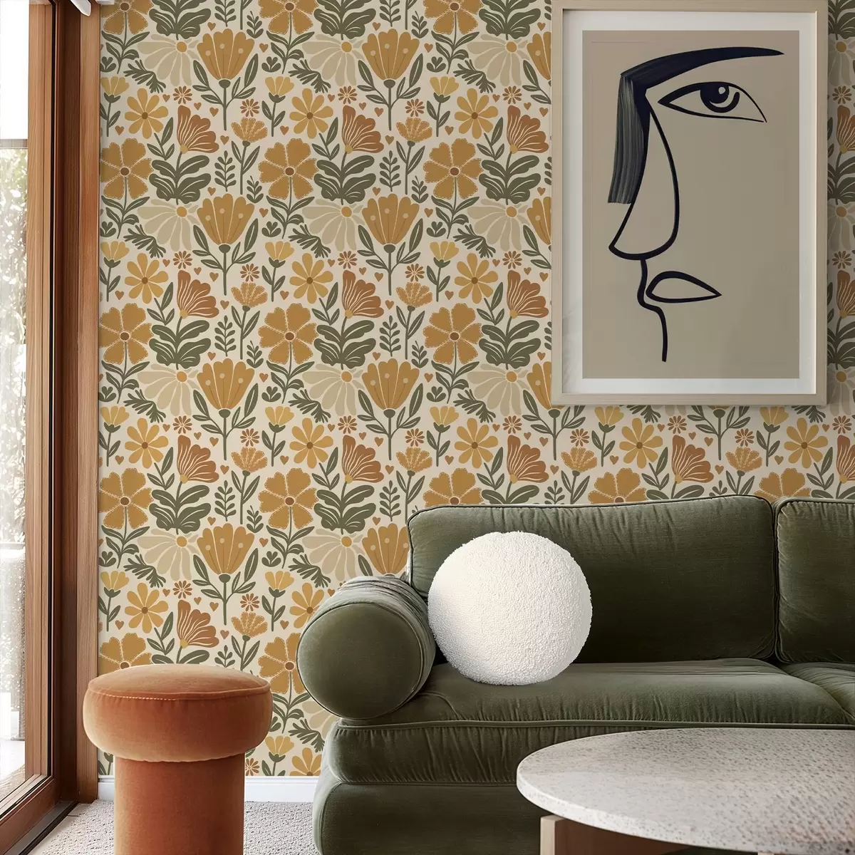 Ταπετσαρία Στυλιζαρισμένα λουλούδια σε ζεστούς τόνους με καρδιές Nr. a00752