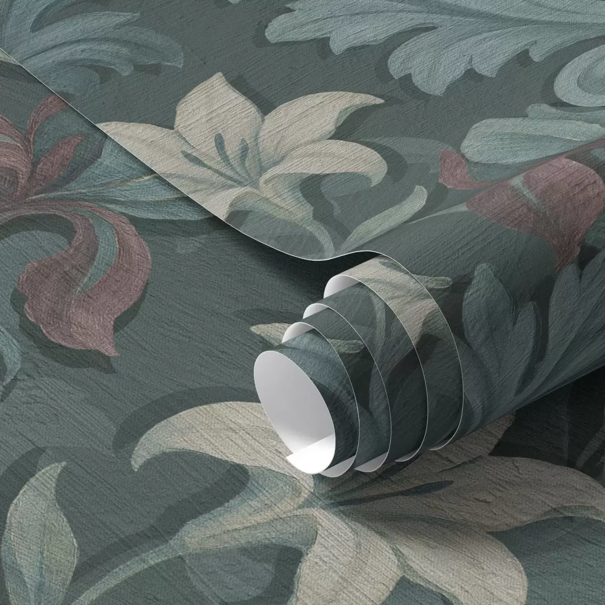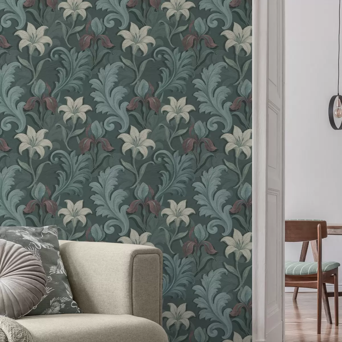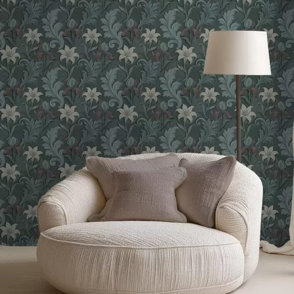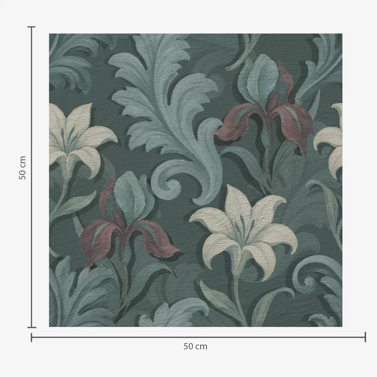 Ταπετσαρία Σκούρο πράσινο φόντο με ίριδες και διακοσμητικά φύλλα Nr. a00755