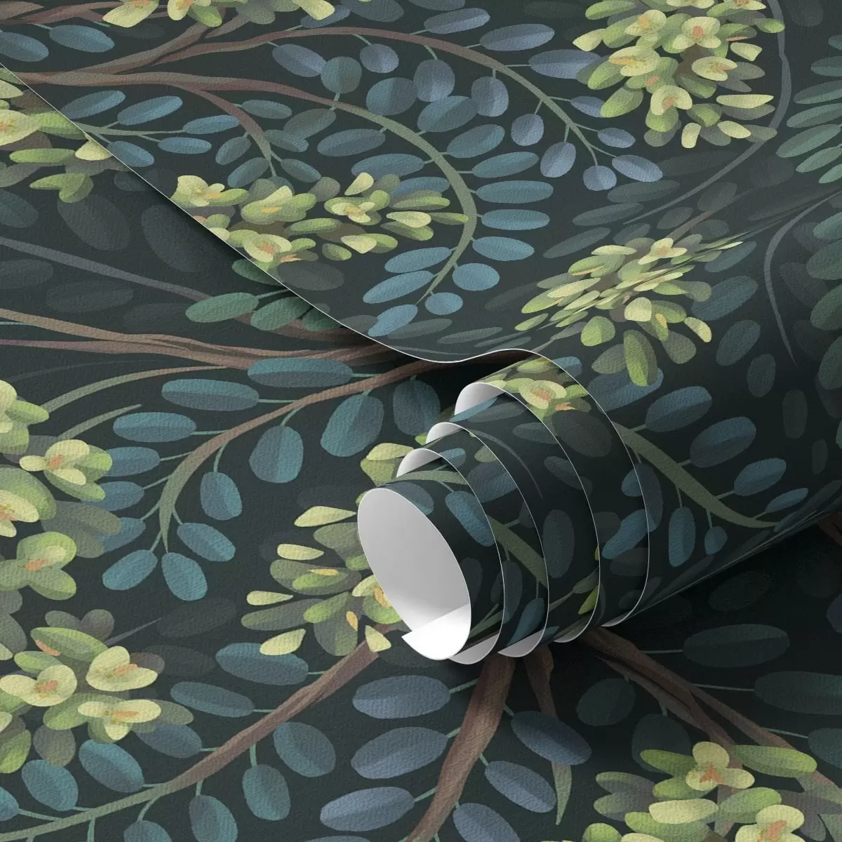 Ταπετσαρία Κλαδιά με πρασινωπές ταξιανθίες σε σκούρο φόντο Nr. a00786