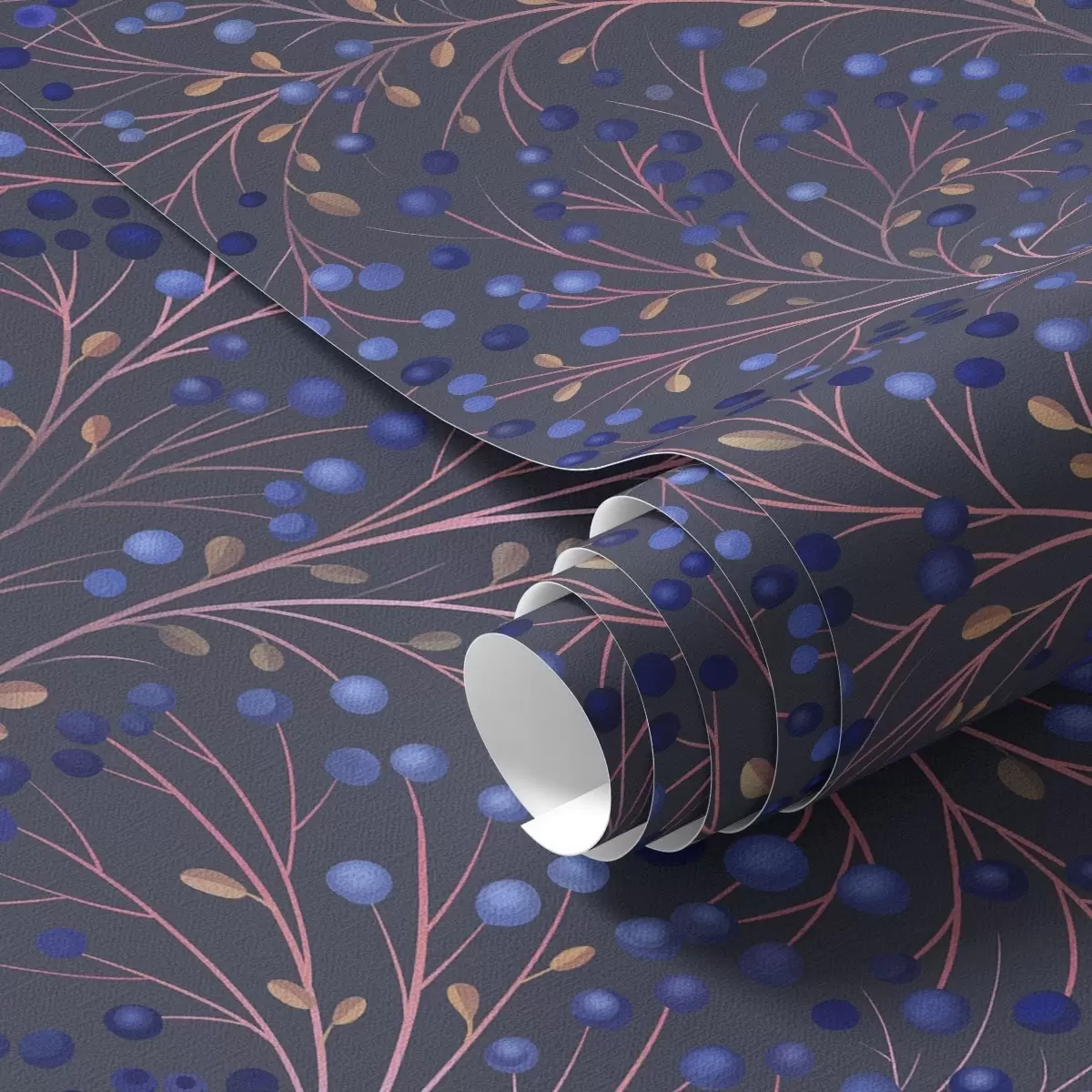 Ταπετσαρία Ροζ-καφέ κλαδιά και μπλε μούρα σε φόντο γραφίτη Nr. a00787