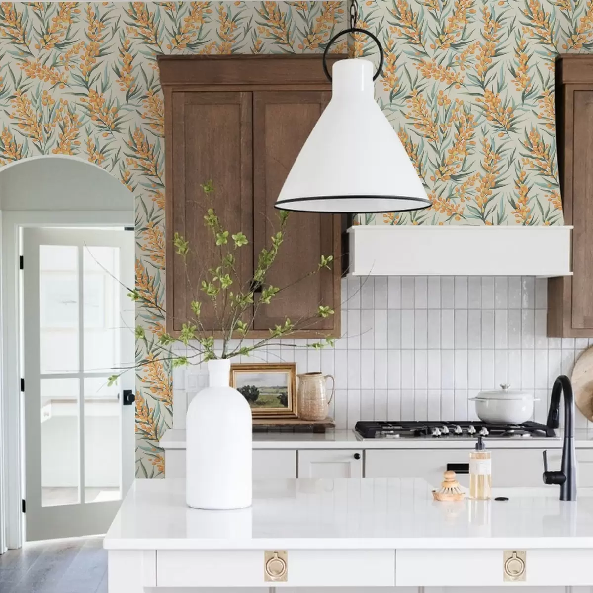 Ταπετσαρία Κλαδιά ιπποφαές με πορτοκαλί μούρα, ανοιχτόχρωμο φόντο Nr. a00792