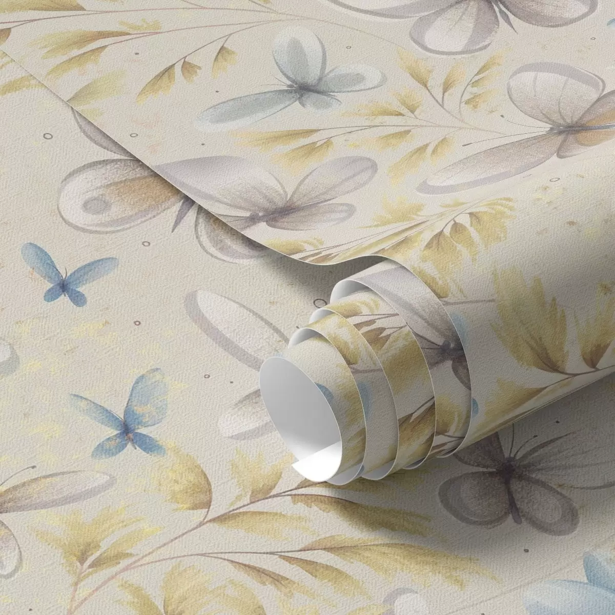 Ταπετσαρία Ελαφριές πεταλούδες ανάμεσα σε χρυσά φύλλα σε ανοιχτόχρωμο φόντο Nr. a00795