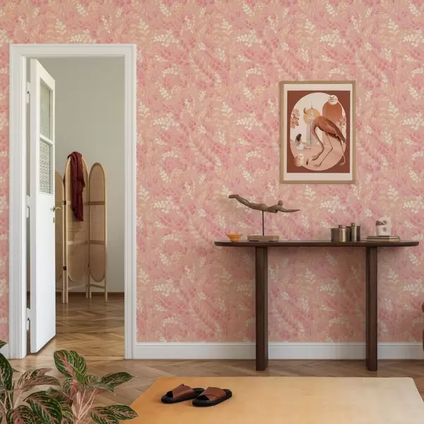 Ταπετσαρία Λεπτό ροζ-ροδακινί φύλλωμα με απαλό χρωματικό λάμψη Nr. a00799