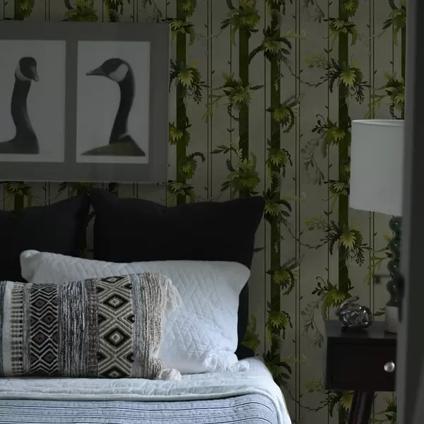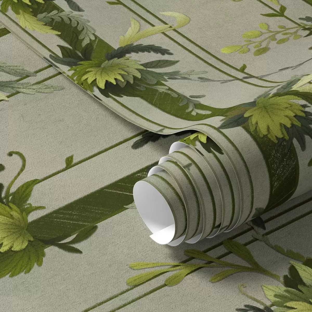 Ταπετσαρία Πράσινα φύλλα σε κάθετες ρίγες σε γκρι φόντο Nr. a00807v1