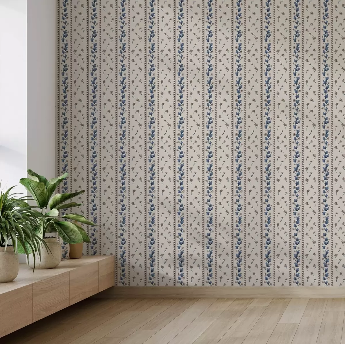Ταπετσαρία Κάθετες λουλουδάτες ρίγες σε μπλε-καφέ αποχρώσεις Nr. a00811v3