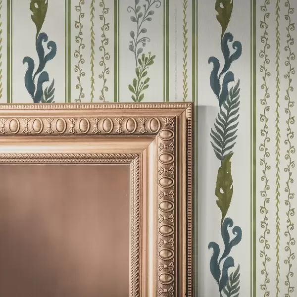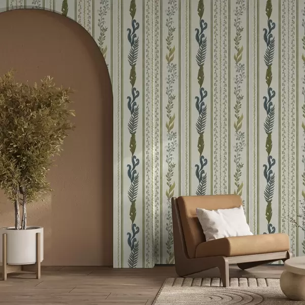 Ταπετσαρία Ρίγες με διακοσμητικά σπειροειδή μοτίβα και μεγάλα κλαδιά σε αποχρώσεις του πράσιν Nr. a00823