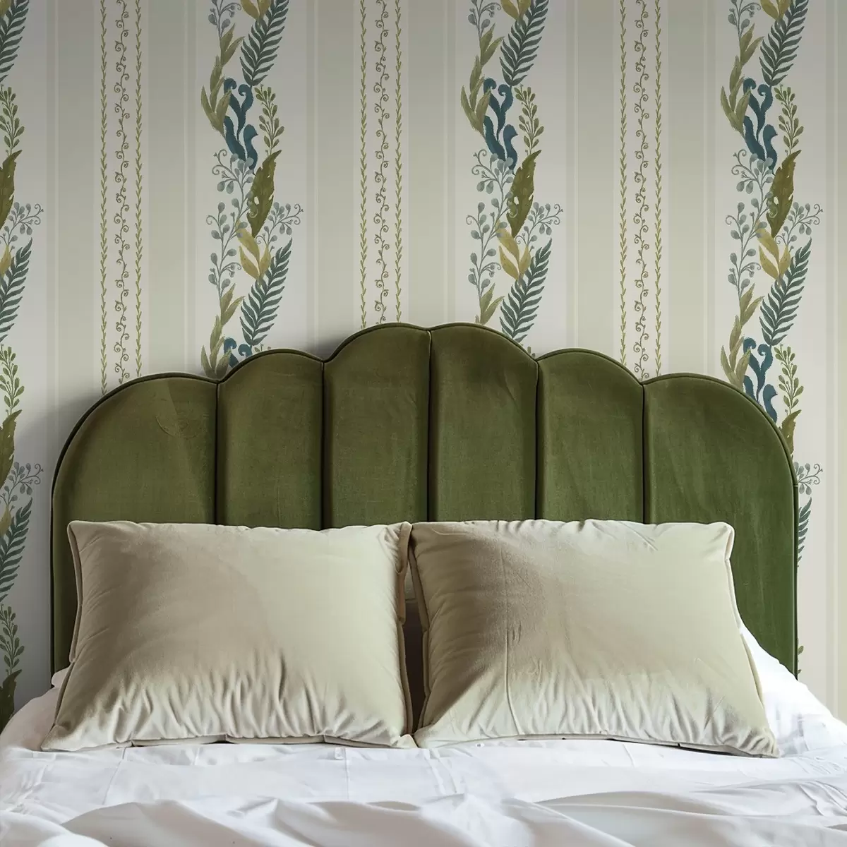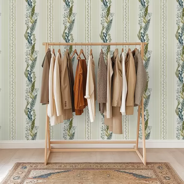 Ταπετσαρία Φαρδιές ρίγες με ζωγραφικά κλαδιά σε αποχρώσεις του μπλε-ελιάς Nr. a00825