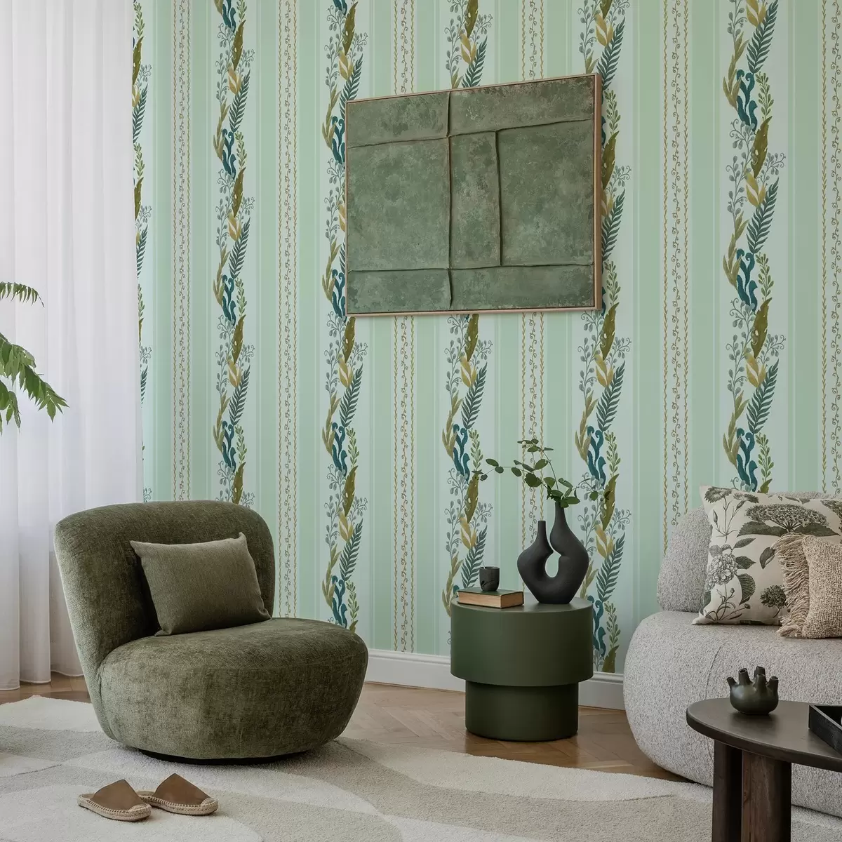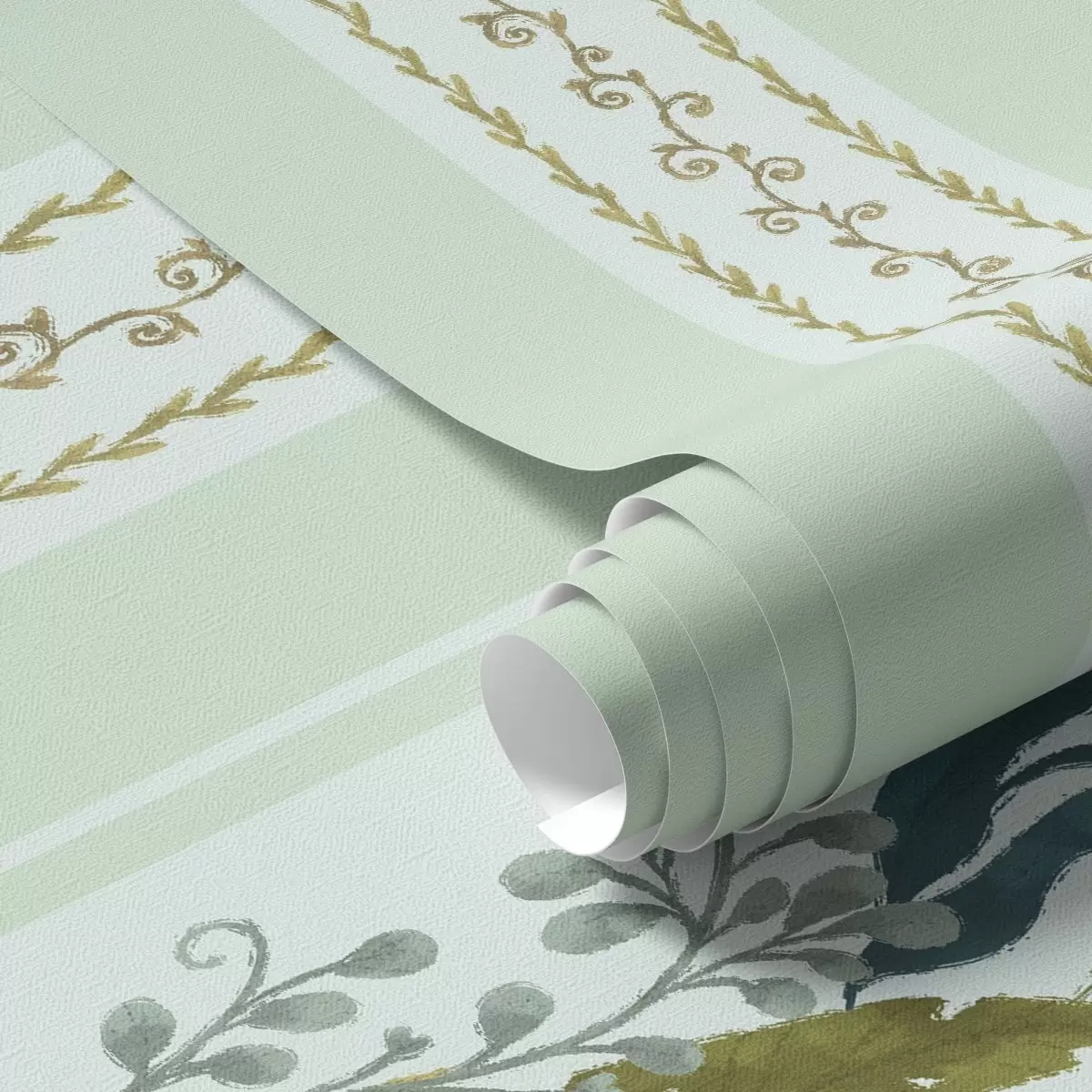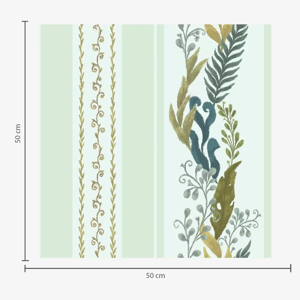 Ταπετσαρία Φαρδιές ρίγες με ζωγραφικά κλαδιά σε απαλό χρώμα μέντας Nr. a00825v1