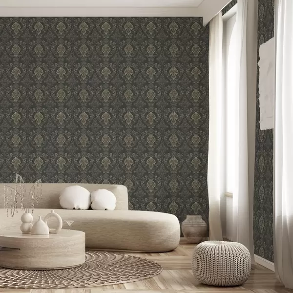 Ταπετσαρία Δαμασκηνό σε σκούρο γραφίτη φόντο, με πινελιές σε χρώμα ελιάς-ώχρας Nr. a00828v5