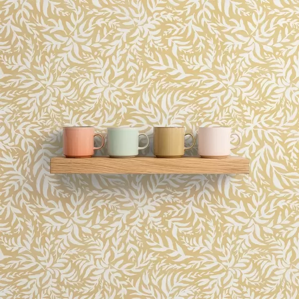 Ταπετσαρία Λευκό μοτίβο φύλλων σε ζεστό χρώμα ώχρας, στροβιλιστικός ρυθμός a00845