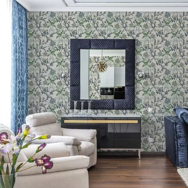 Ταπετσαρία Μπλε-πράσινα λαϊκά λουλούδια και φύλλα σε κρεμ χρώμα Nr. a00863