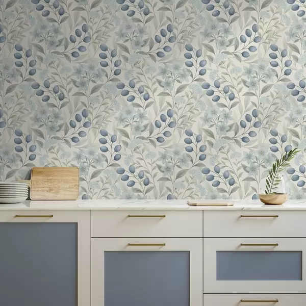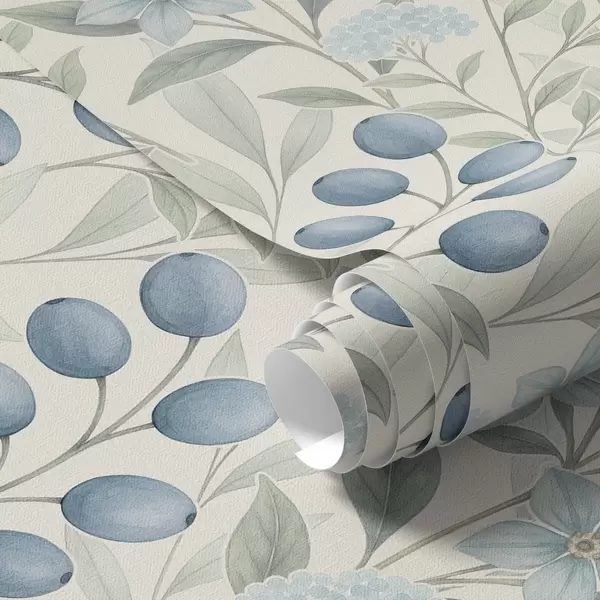 Ταπετσαρία Μπλε μούρα και ανοιχτόχρωμα λουλούδια σε ιβουάρ φόντο Nr. a00872