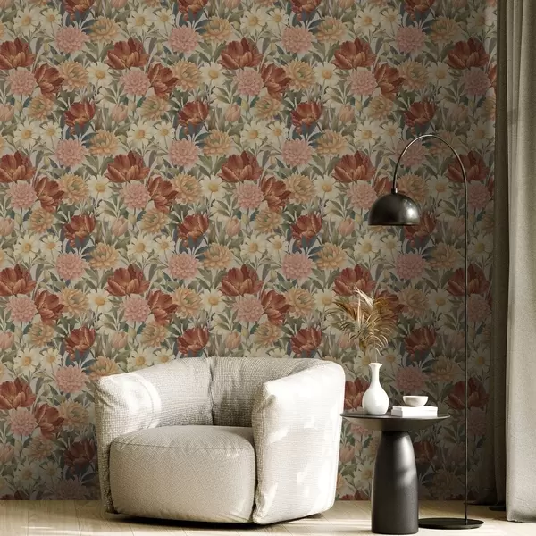 Ταπετσαρία Vintage κήπος ανθίζει σε ζεστά χρώματα τερακότα και ροδάκινο Nr. a00874