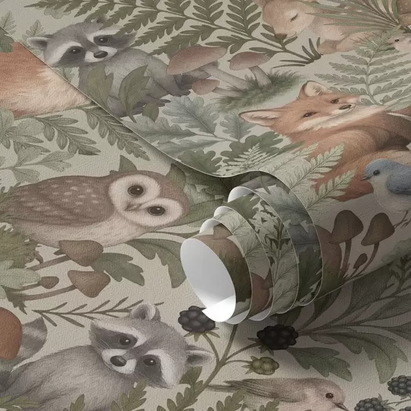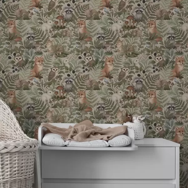 Ταπετσαρία Ζώα του δάσους, φτέρες και μανιτάρια σε ανοιχτό μπεζ χρώμα Nr. a00880v1