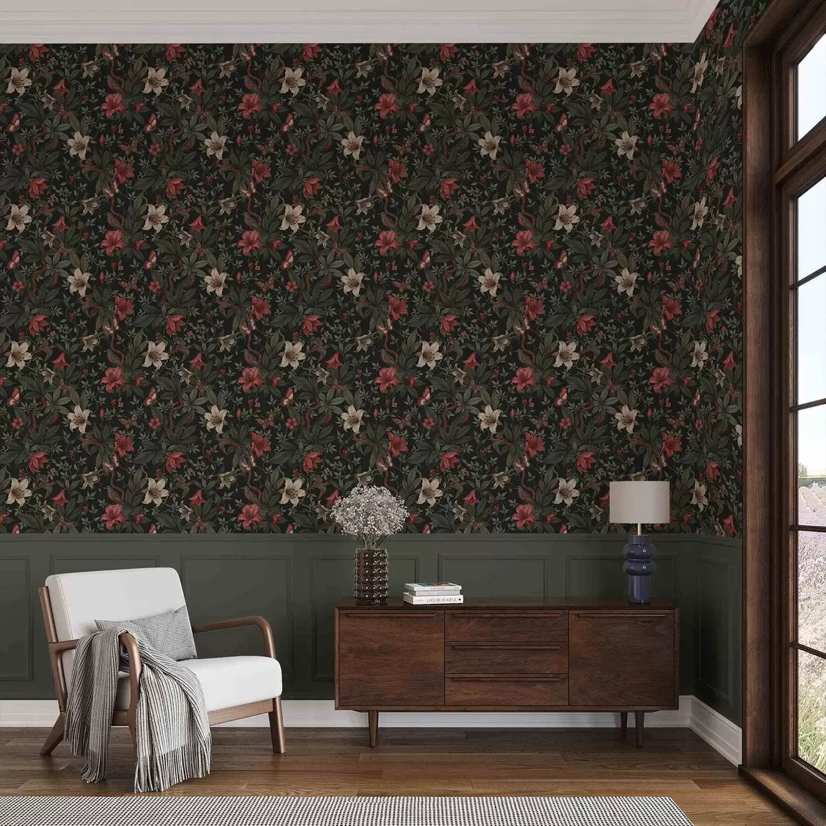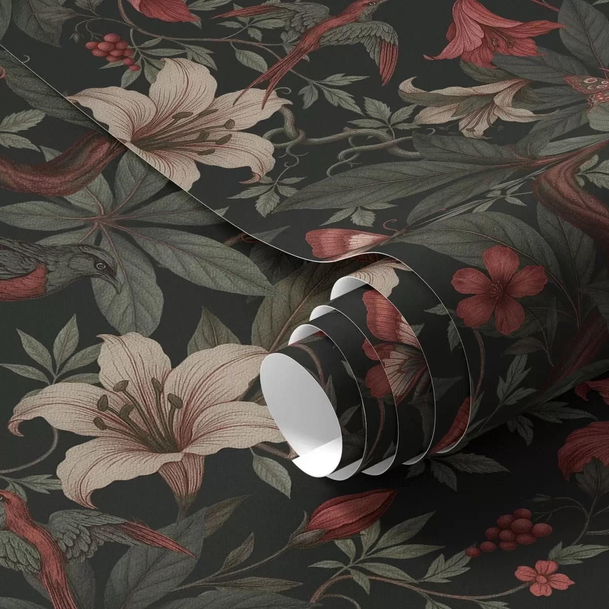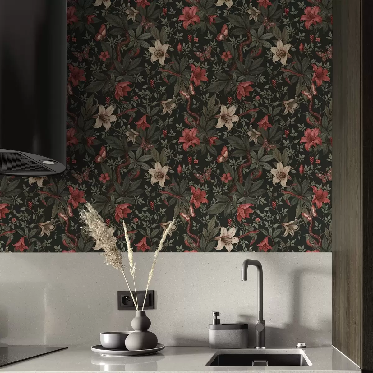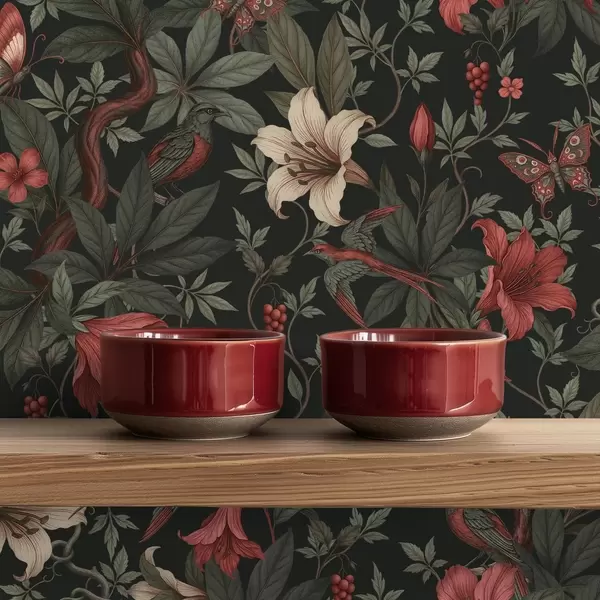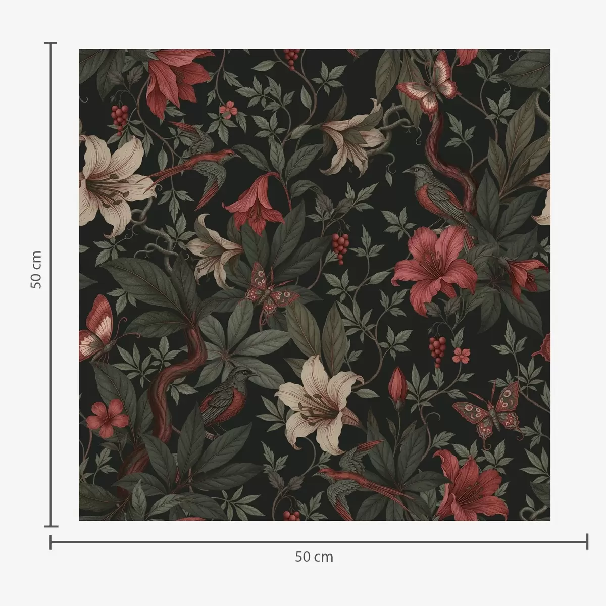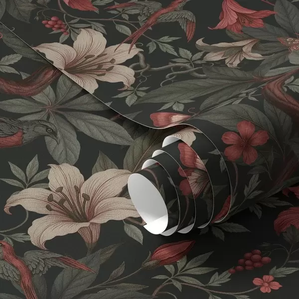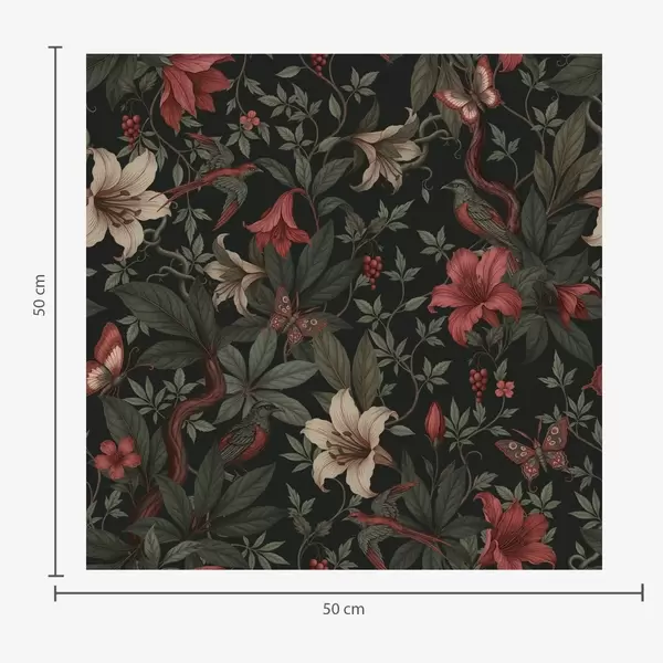 Ταπετσαρία Σκούρα λουλούδια της ζούγκλας με πουλιά και πεταλούδες Nr. a00895