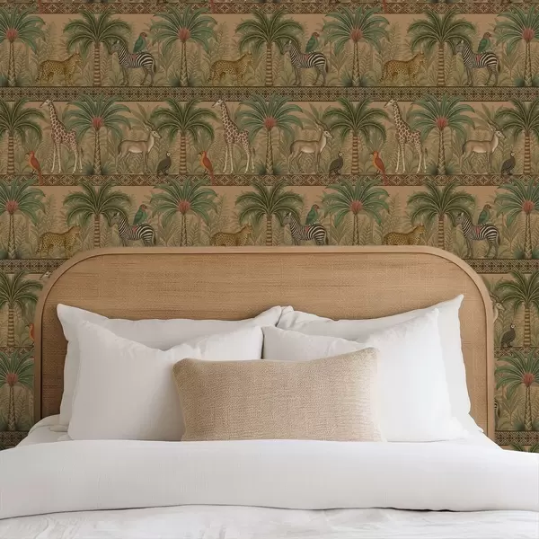 Ταπετσαρία Διακοσμητικά ζώα της σαβάνας ανάμεσα σε φοίνικες και μπορντούρες Nr. a00898