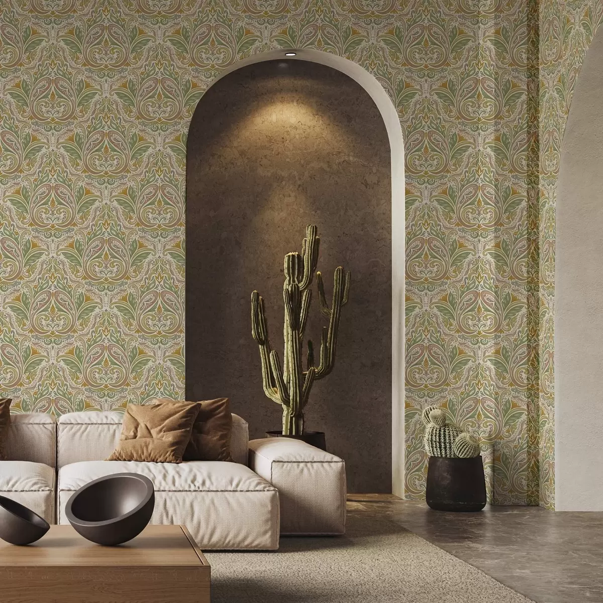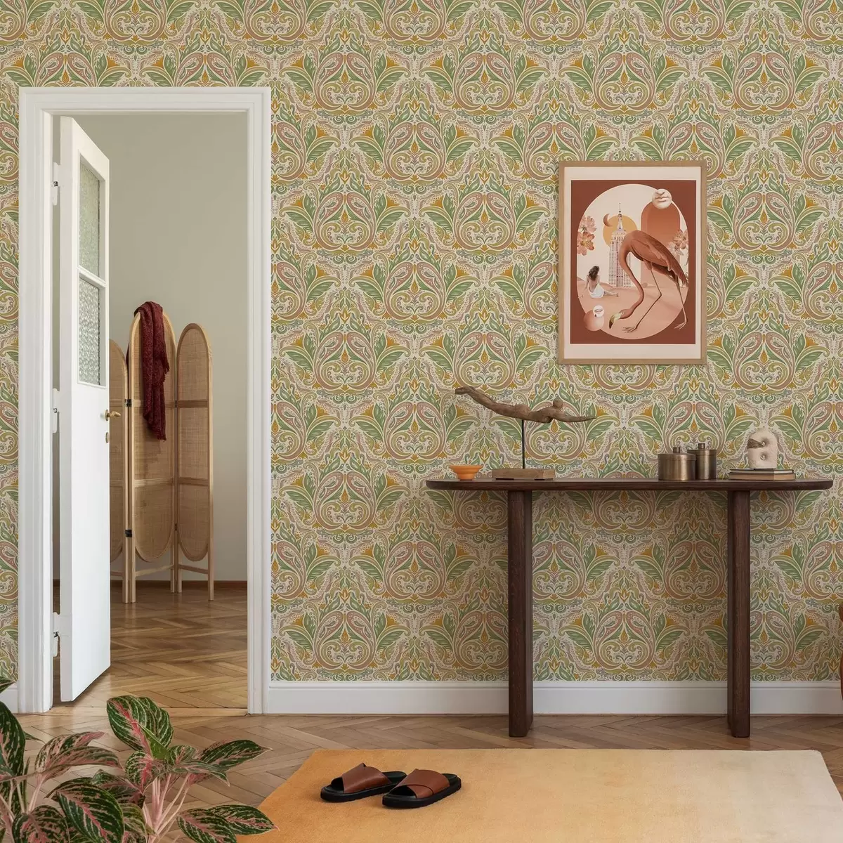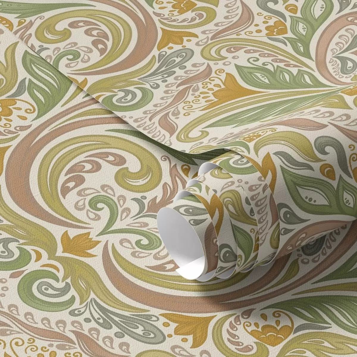 Ταπετσαρία Διακοσμητικά φυλλώδη στροβιλίσματα σε αποχρώσεις του πράσινου και του τερακότα Nr. a00927v1