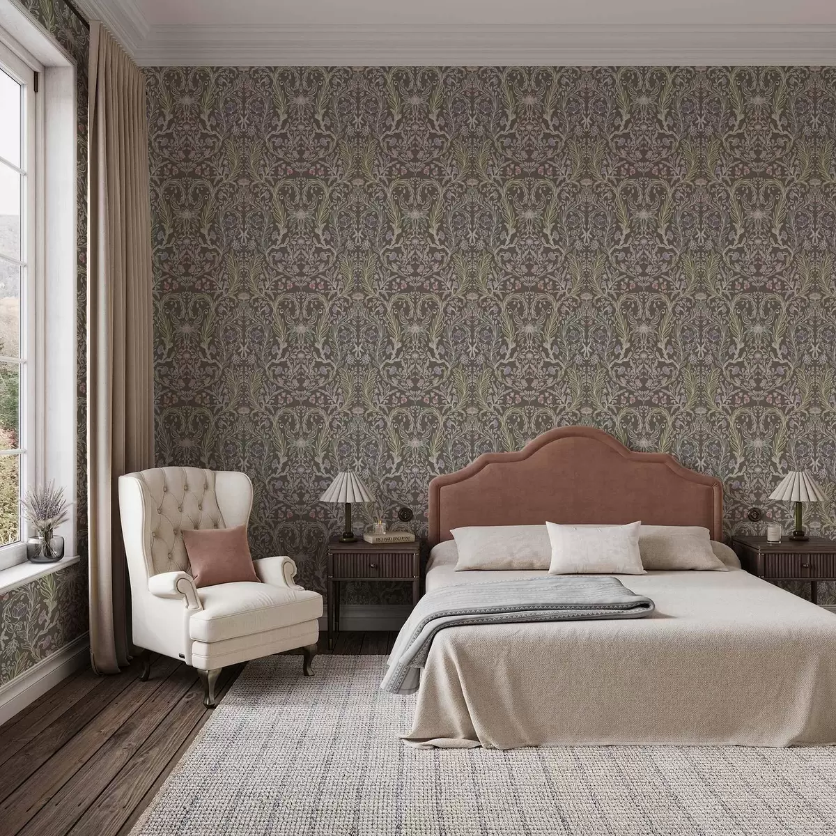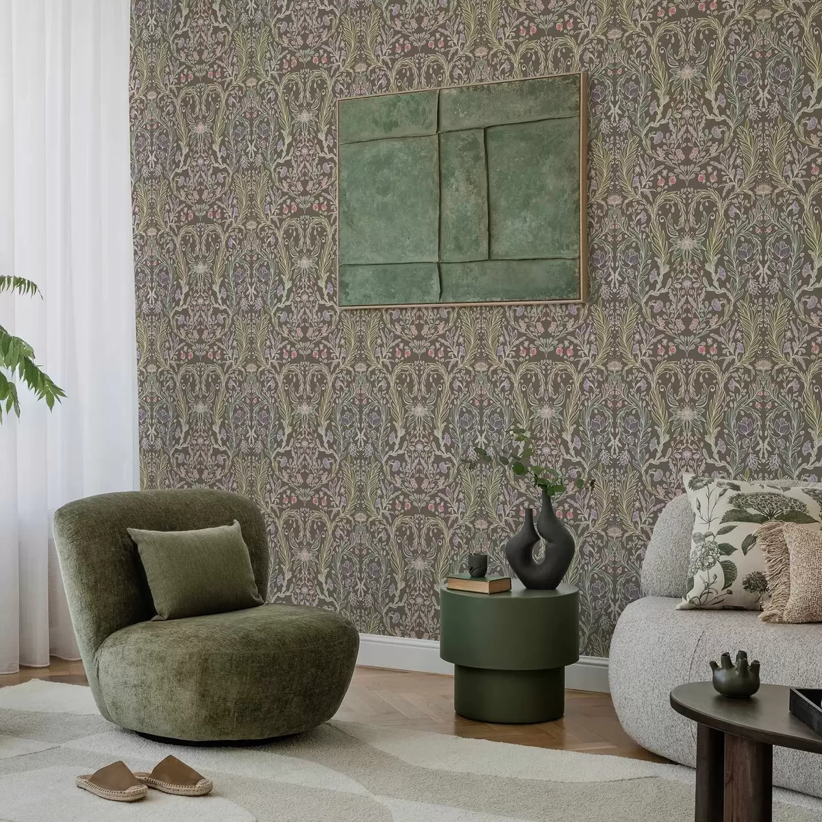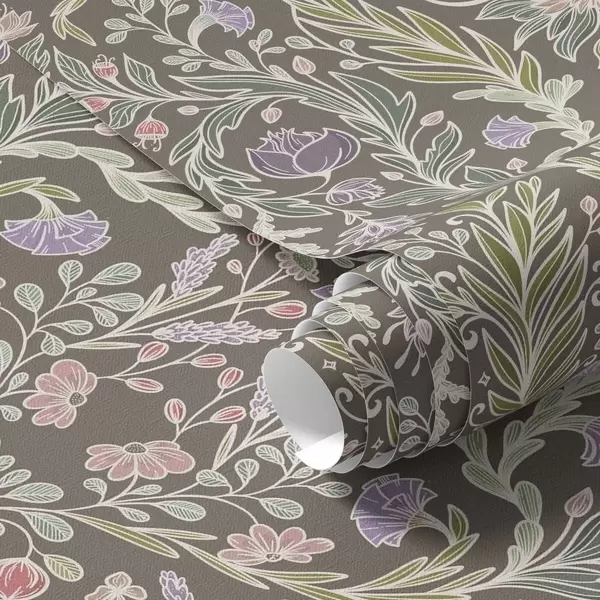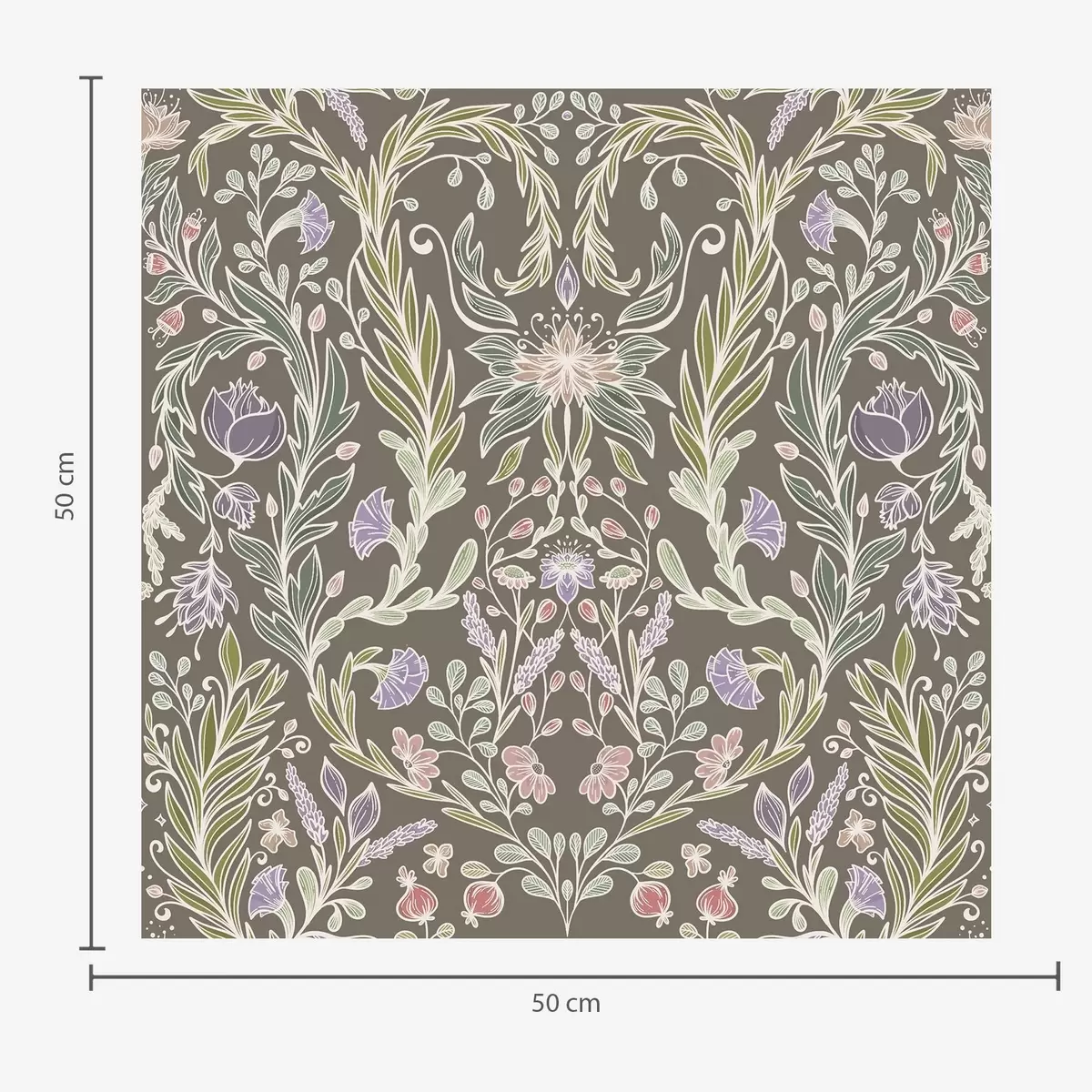 Ταπετσαρία Συμμετρικά λουλούδια και φύλλα σε καφέ-γκρι φόντο Nr. a00928v2