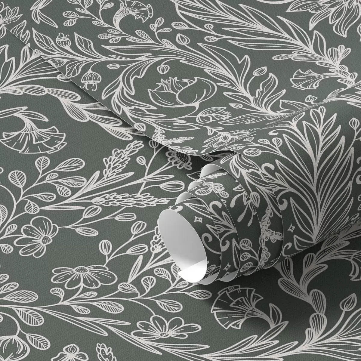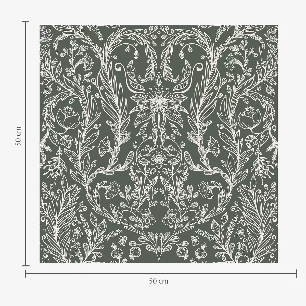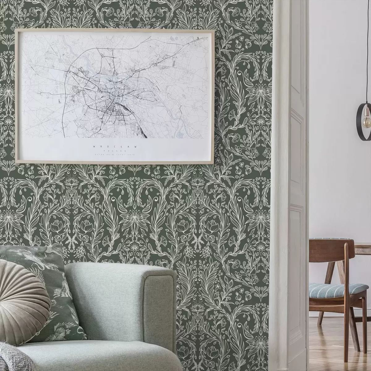 Ταπετσαρία Γραμμικό floral μοτίβο σε σκούρο πράσινο φόντο Nr. a00929