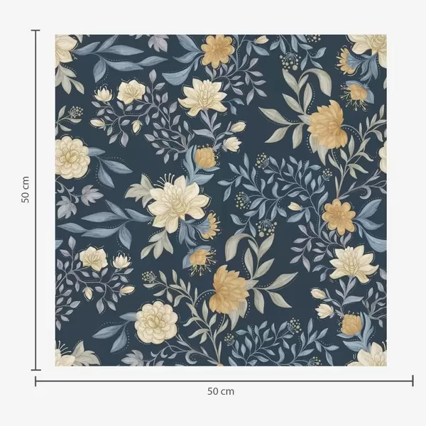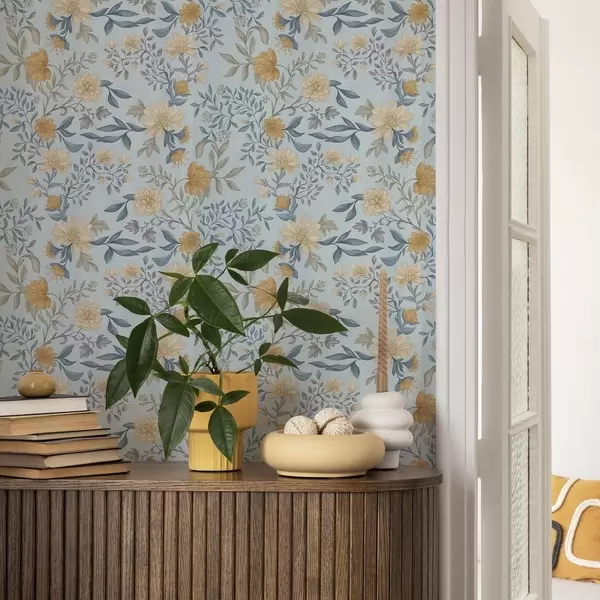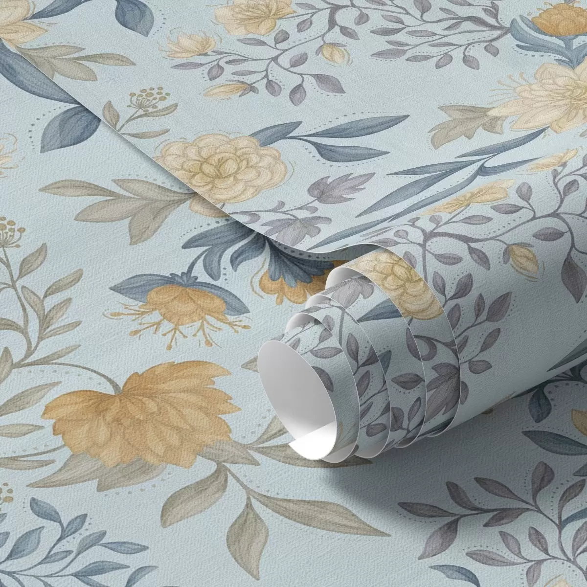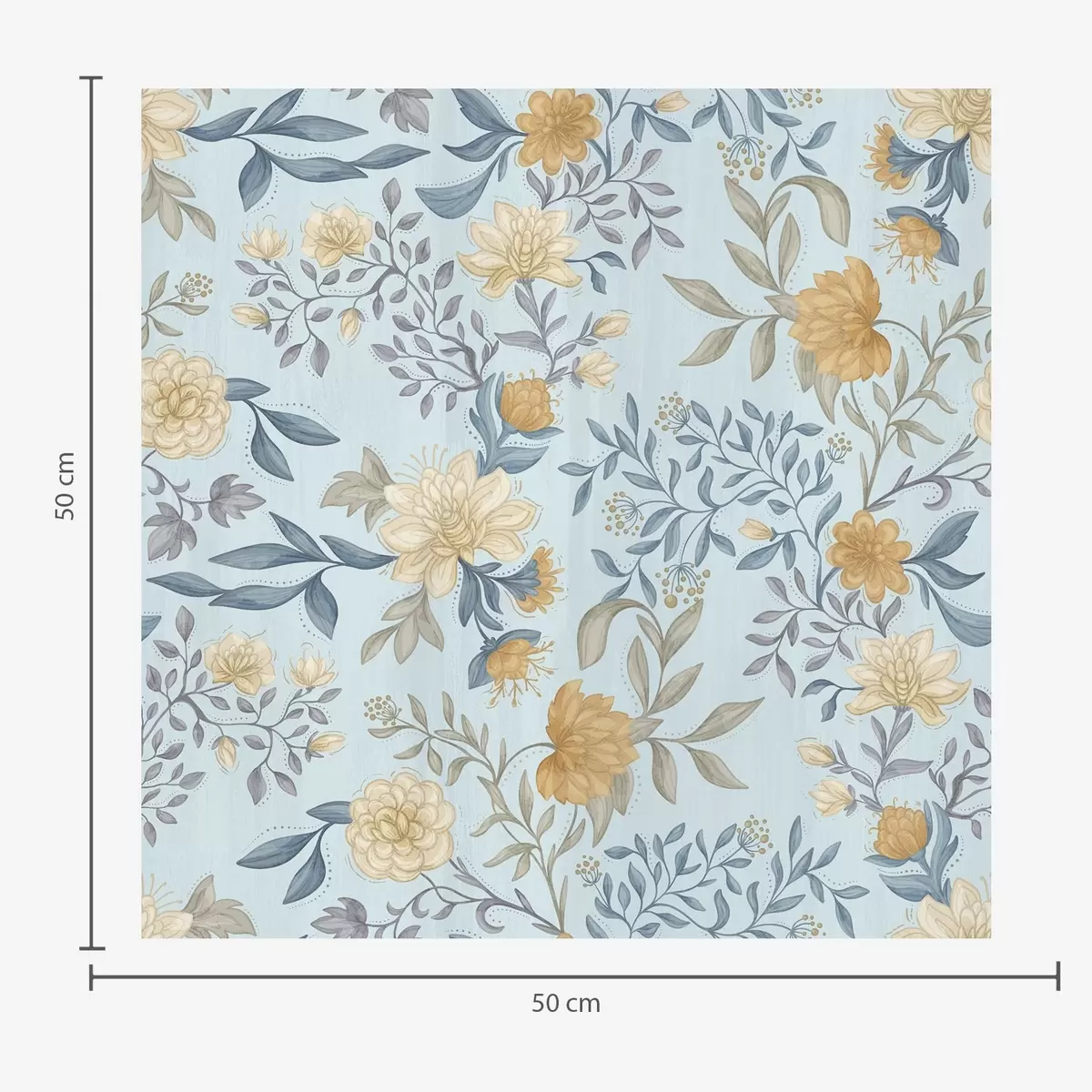 Ταπετσαρία Κίτρινα και μπλε λουλούδια με φύλλα σε γαλάζιο φόντο Nr. a00934