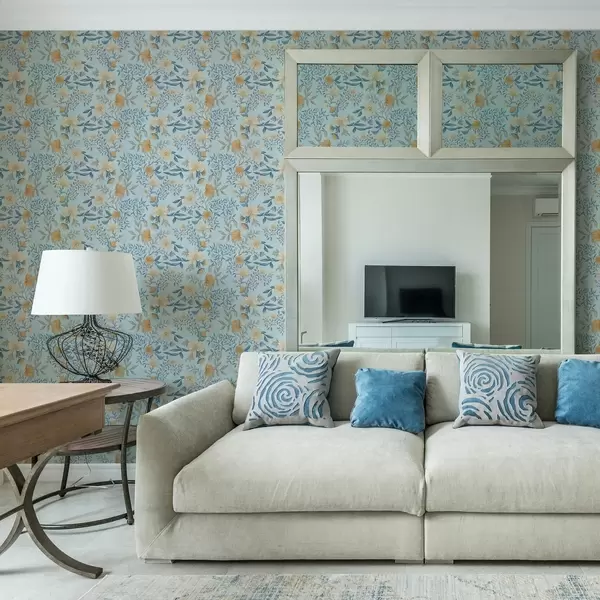 Ταπετσαρία Κίτρινα και μπλε λουλούδια με φύλλα σε γαλάζιο φόντο Nr. a00934