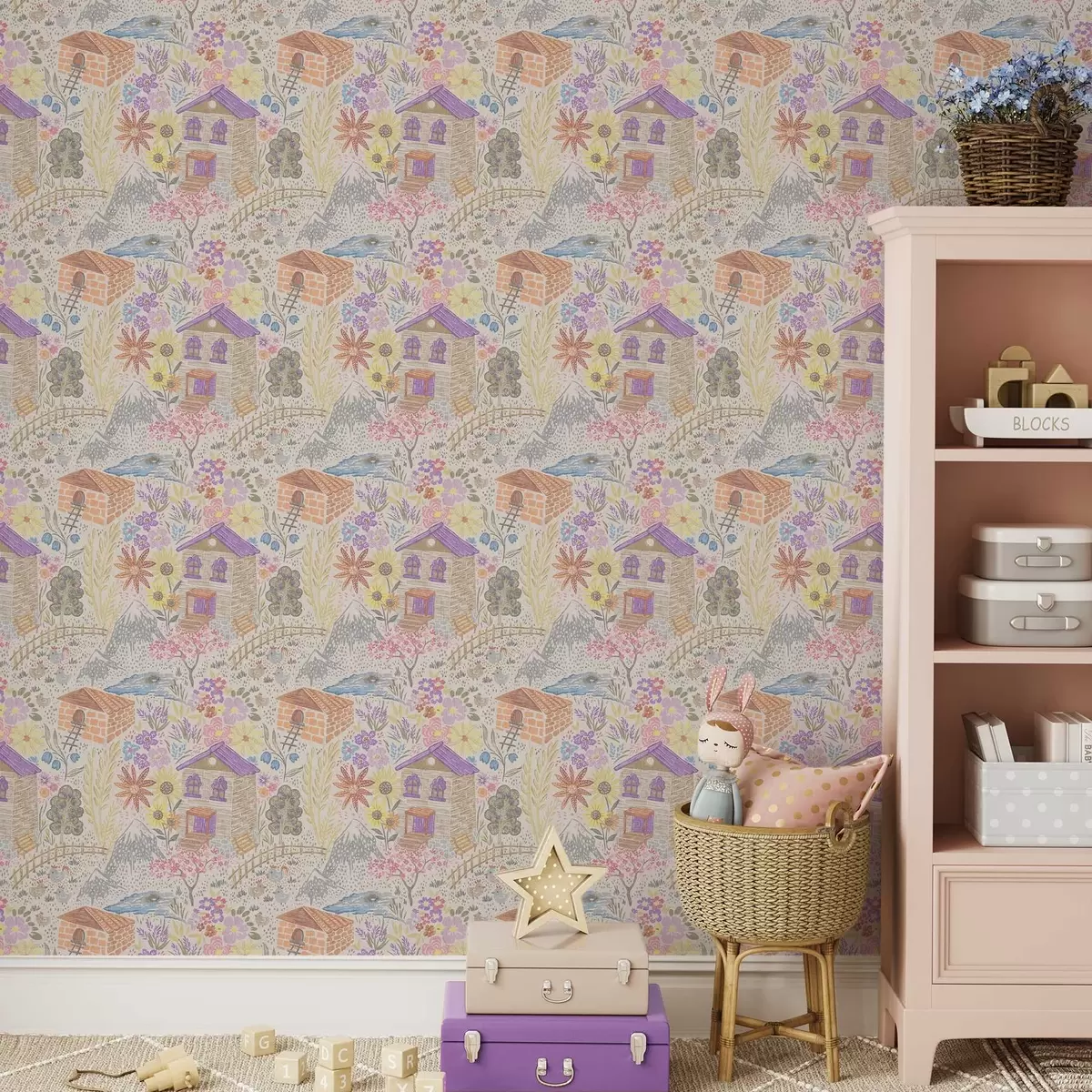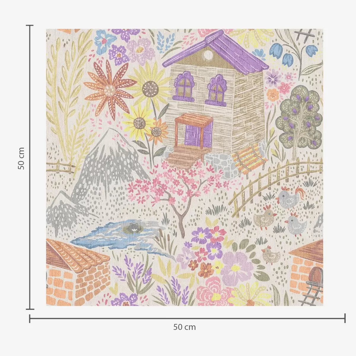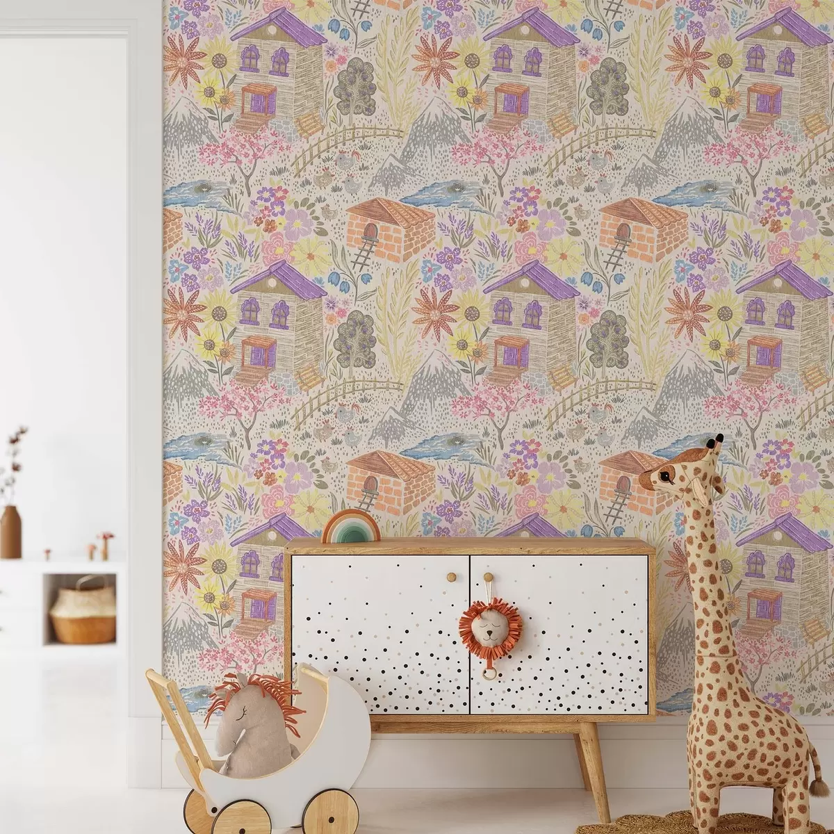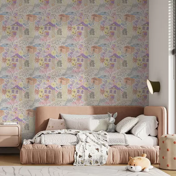 Ταπετσαρία Παιδικό σχέδιο χωριού με σπίτι, βουνά και λουλούδια Nr. a00952