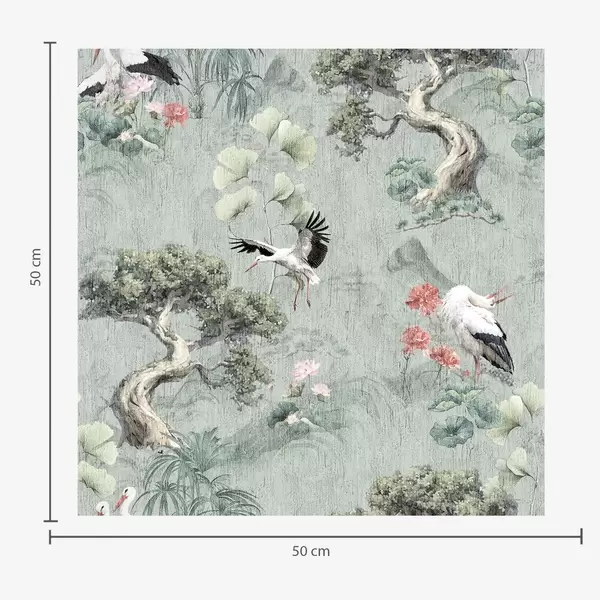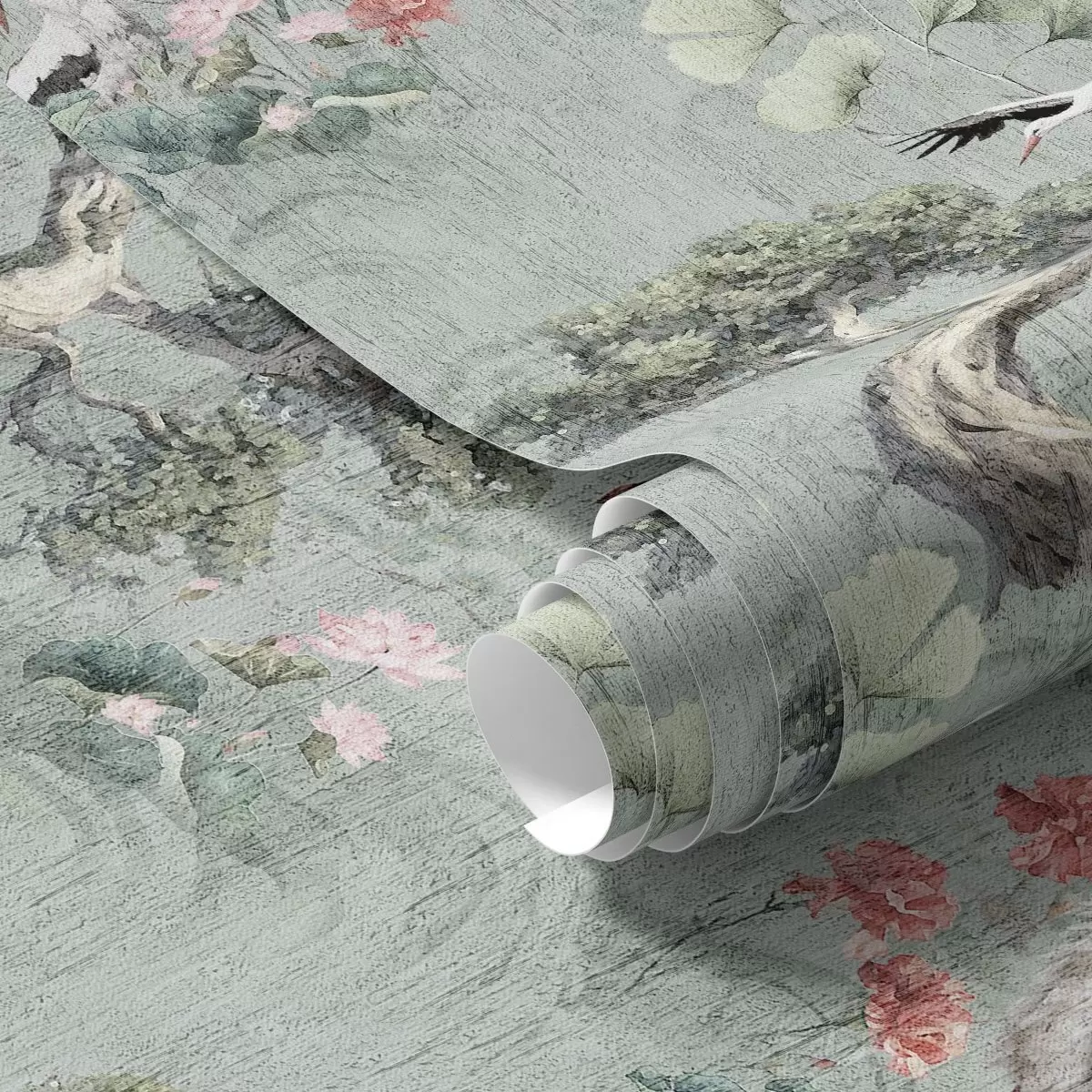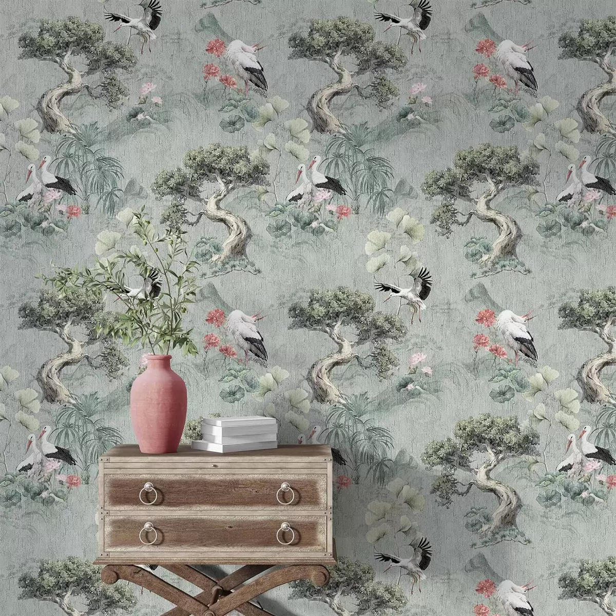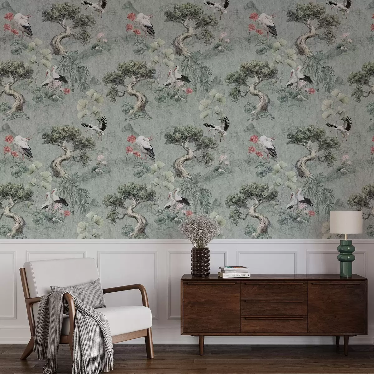 Ταπετσαρία Γερανοί ανάμεσα σε πεύκα και λωτούς σε ένα ήρεμο πράσινο φόντο Nr. a00962