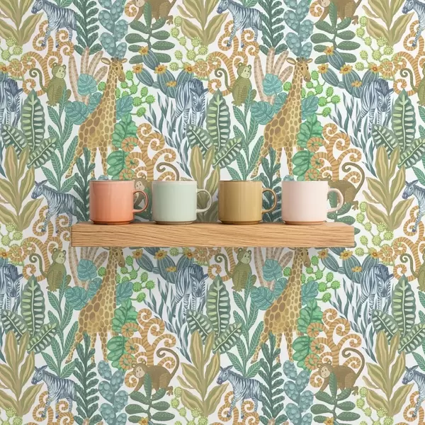 Ταπετσαρία Χαρούμενα ζώα της σαβάνας ανάμεσα σε φύλλα σε λευκό φόντο Nr. a01000