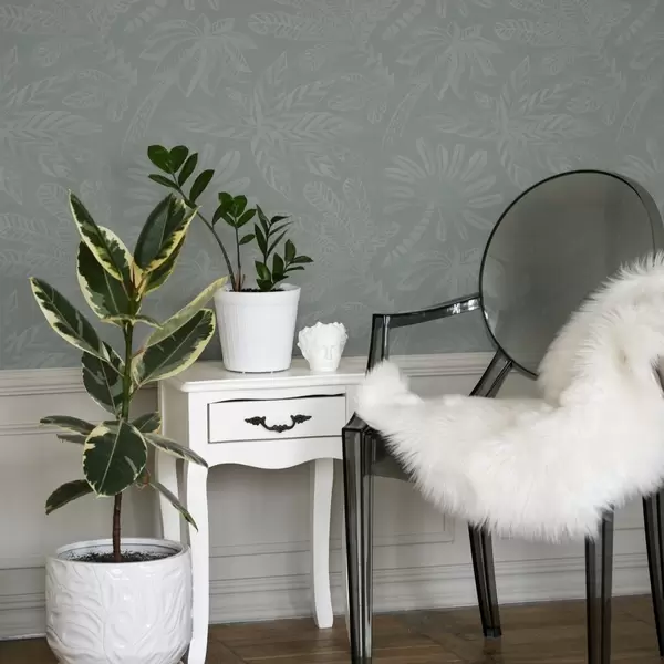 Ταπετσαρία Ματ μεγάλα τροπικά φύλλα σε παλέτα χρωμάτων μέντας-γκρι Nr. a01001