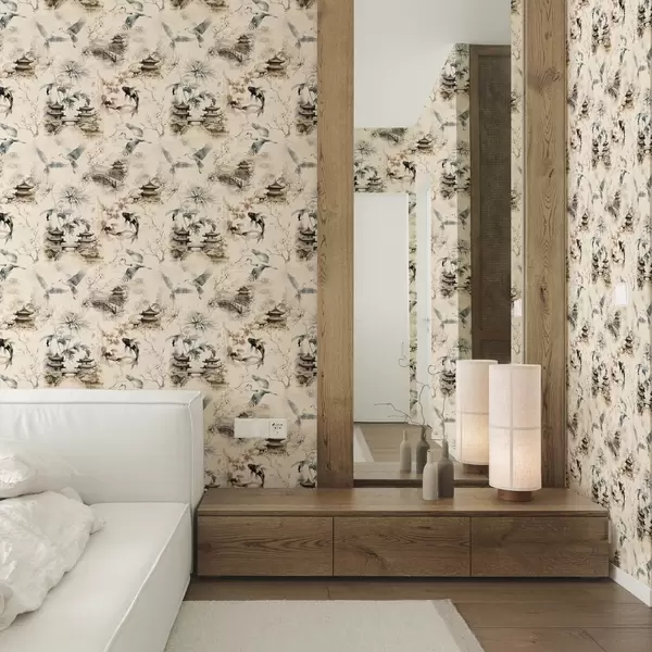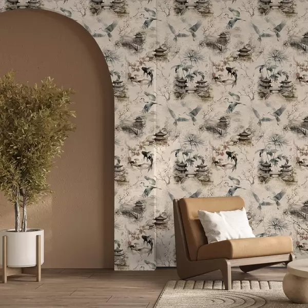 Ταπετσαρία Ιαπωνικοί ναοί, ψάρια koi και γερανοί σε απαλό φόντο Nr. a01040