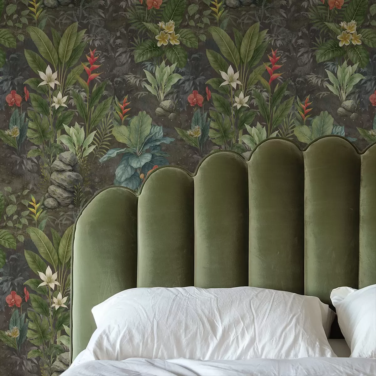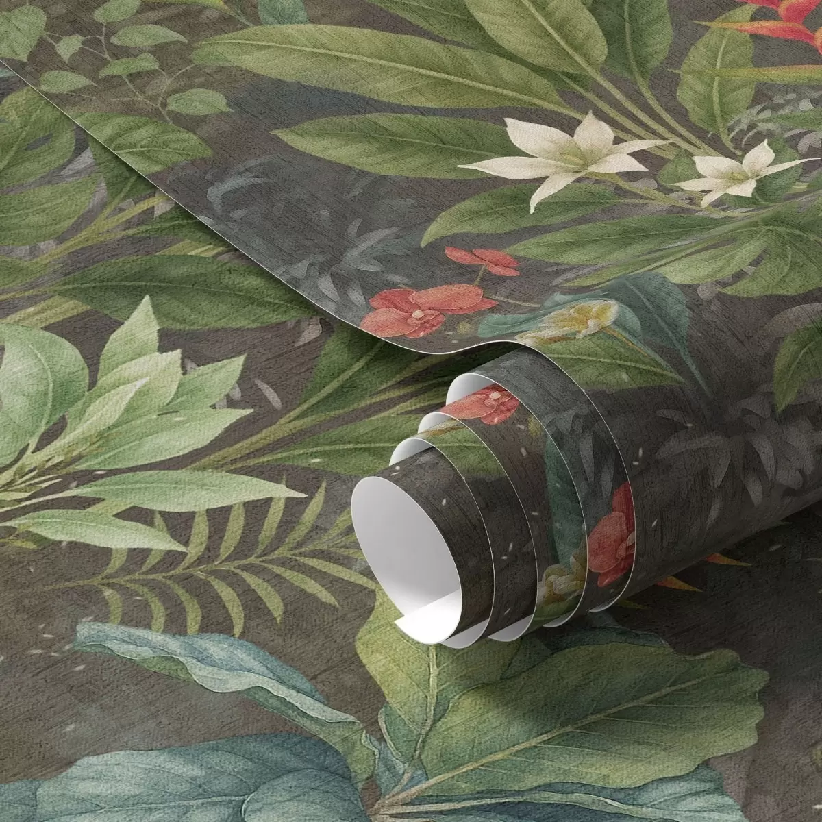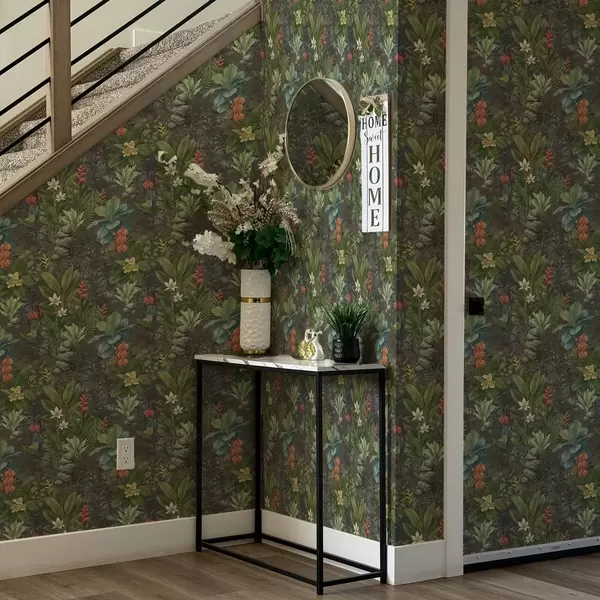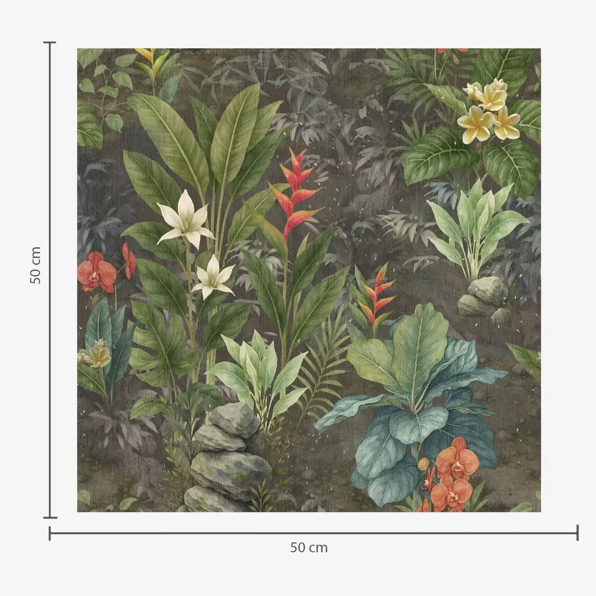 Ταπετσαρία Σκοτεινός τροπικός κήπος με φωτεινά λουλούδια και φυλλώματα Nr. a01079