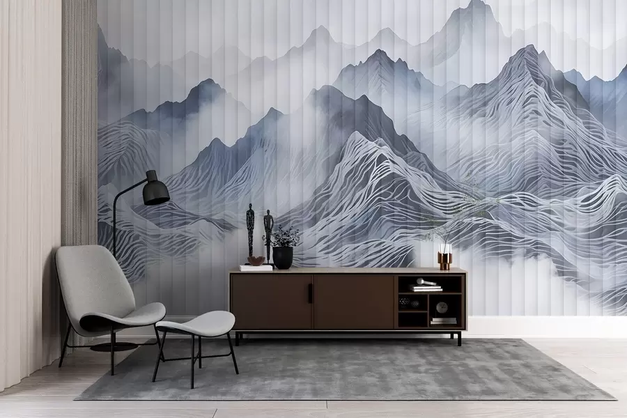 Ομιχλώδες αφηρημένο ορεινό τοπίο με κυλιόμενους λόφους και κορυφές σε αποχρώσεις του γκρι και του λευκού