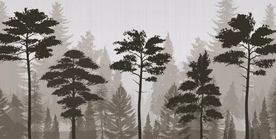 Ψηλά πεύκα σε ένα ομιχλώδες δάσος, με ομιχλώδη, θολή ατμόσφαιρα
