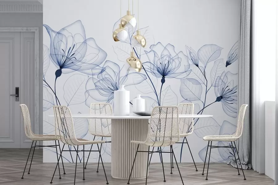 Λεπτά μινιμαλιστικά μπλε λουλούδια με διαφανή πέταλα και φύλλα, σε λευκό φόντο