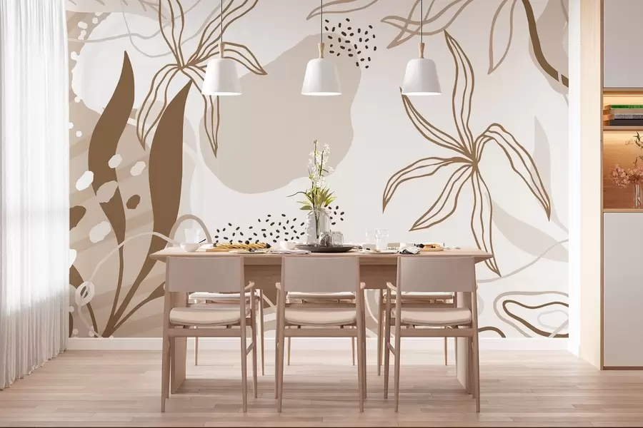Λεπτή μινιμαλιστική εκτύπωση λευκών λουλουδιών και φύλλων σε μπεζ φόντο
