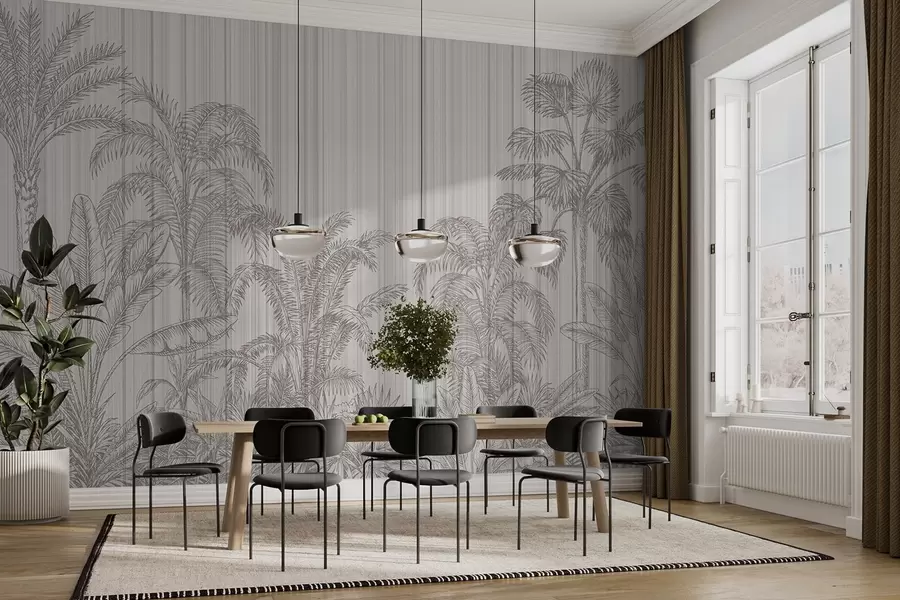 Διάταξη από διάφορα τροπικά φυτά με μεγάλα πράσινα φύλλα, που δημιουργούν μια πλούσια σκηνή φυλλώματος σε ανοιχτό μπεζ χρώμα