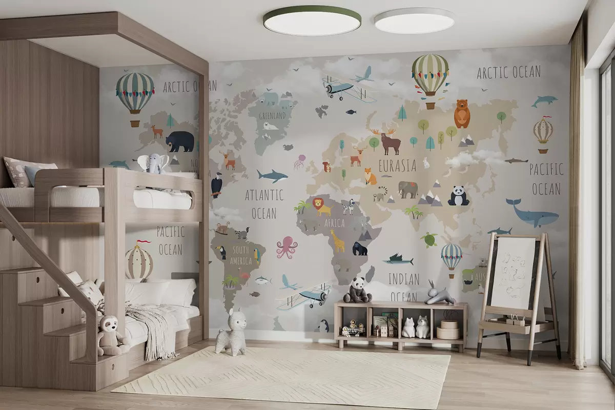 Τοιχογραφίες Παγκόσμιος χάρτης με ζώα και μπαλόνια Nr. u96461