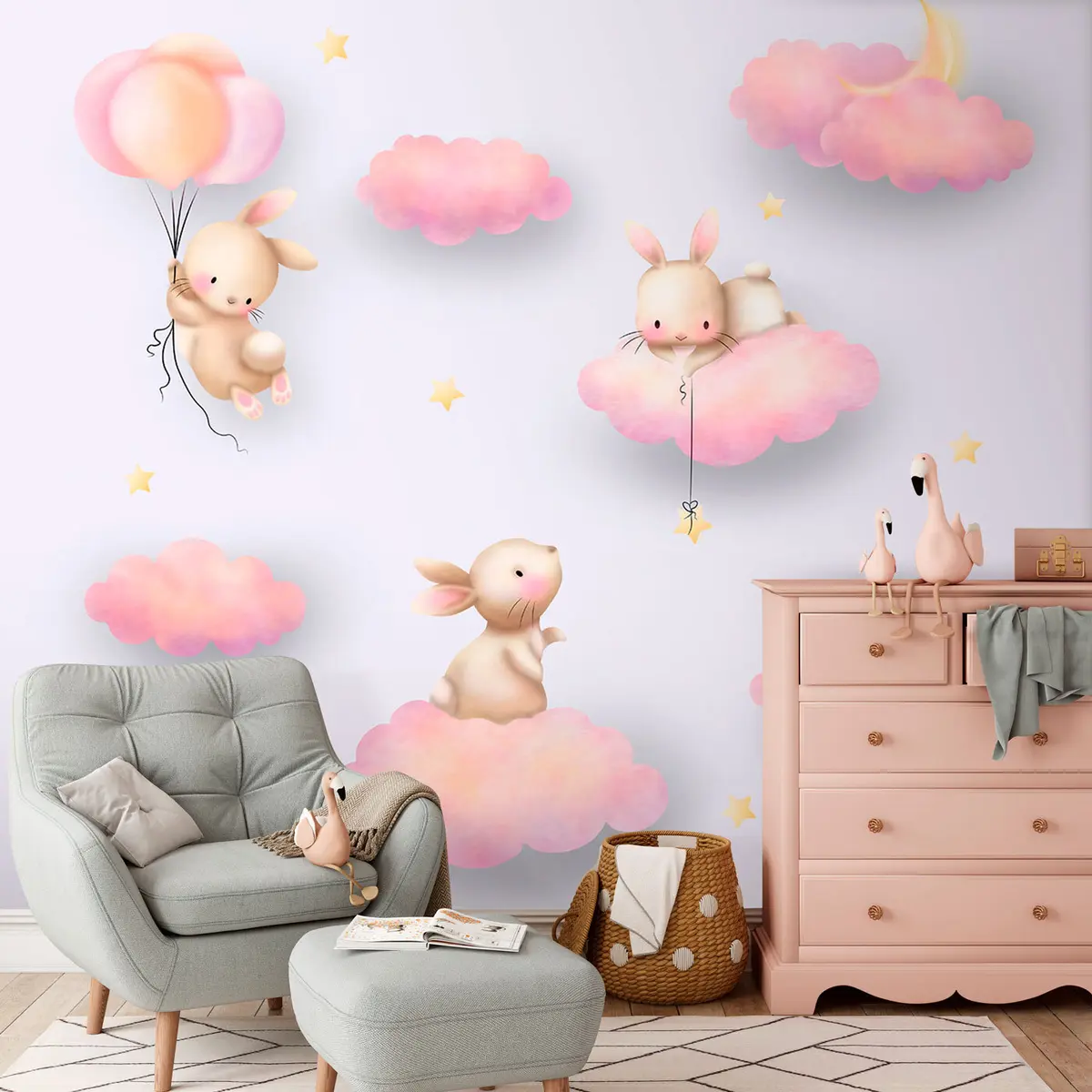 Τοιχογραφίες Λαγουδάκια στα σύννεφα σε παιδικό στυλ Nr. u96613