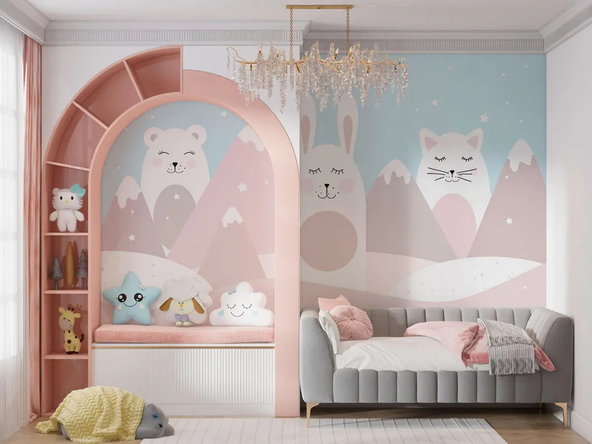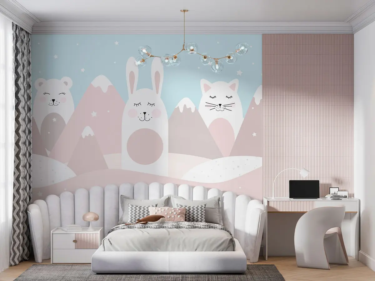 Τοιχογραφίες Κουνέλι, αρκούδα, αλεπού σε φόντο μπεζ χιονισμένων βουνών Nr. u98135