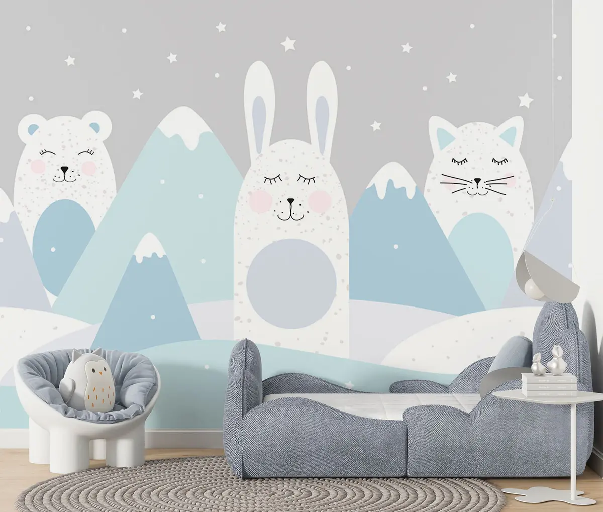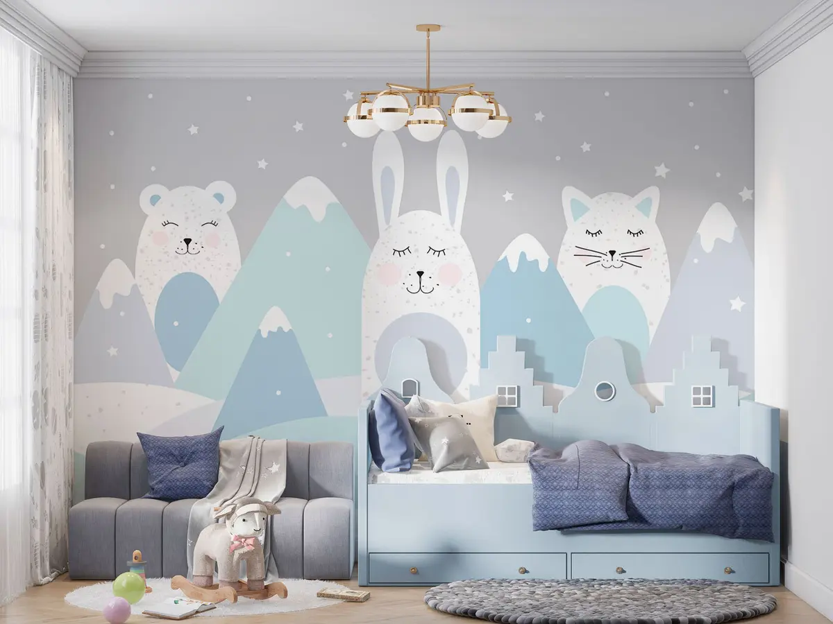 Τοιχογραφίες Κουνέλι, αρκούδα, αλεπού στο φόντο των μπεζ χιονισμένων βουνών Nr. u98135v1