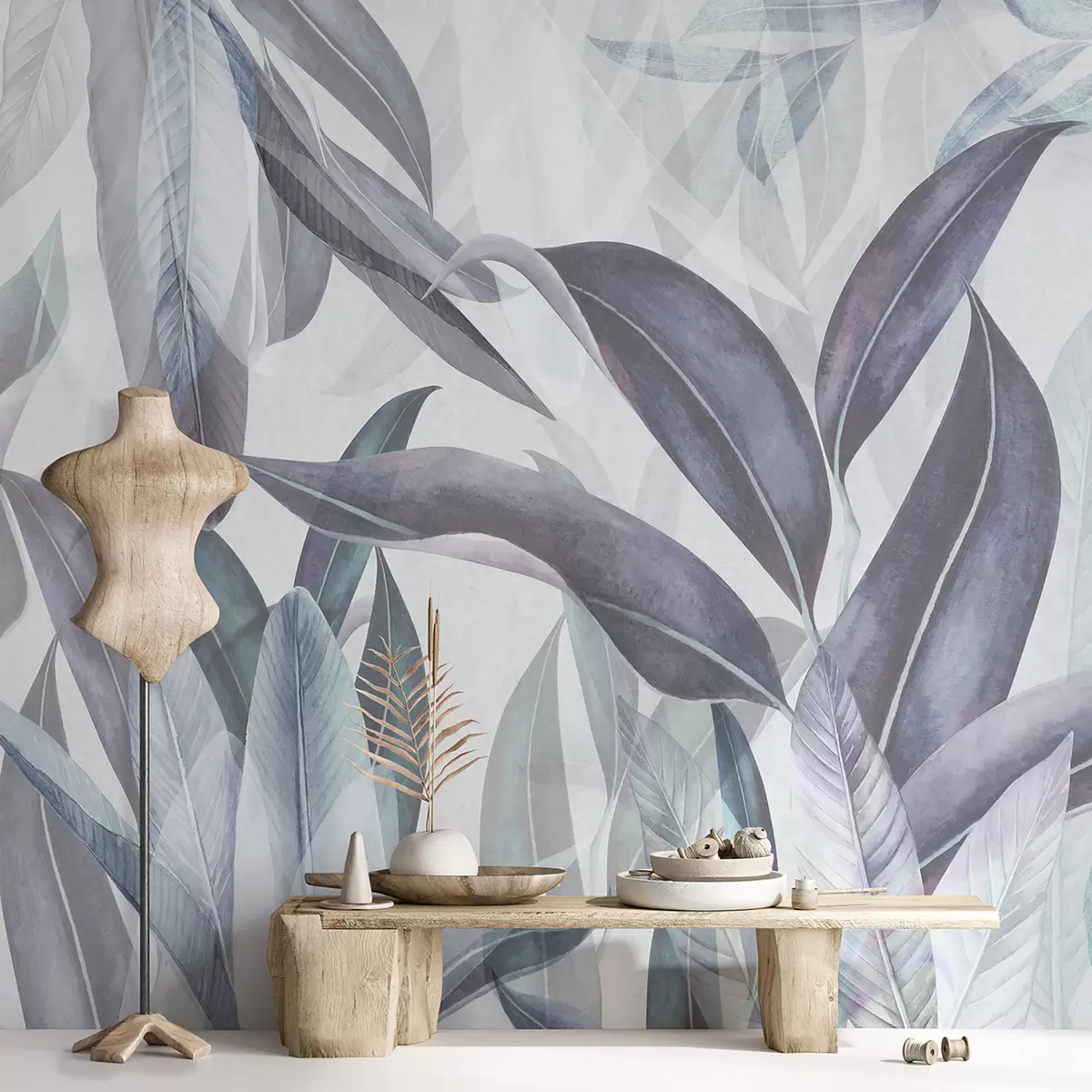 Τοιχογραφίες Πράσινα και ροζ φύλλα φοίνικα σε μπλε χρώματα Nr. u94302v1