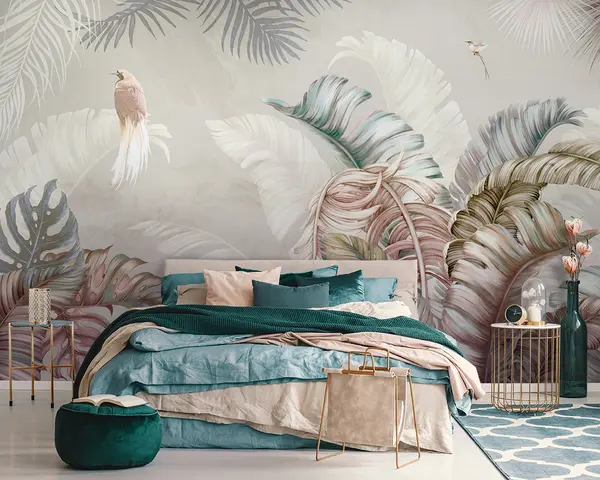Τοιχογραφίες Τροπική εικονογράφηση με φύλλα μπανάνας φοίνικα και πουλιά Nr. u96254