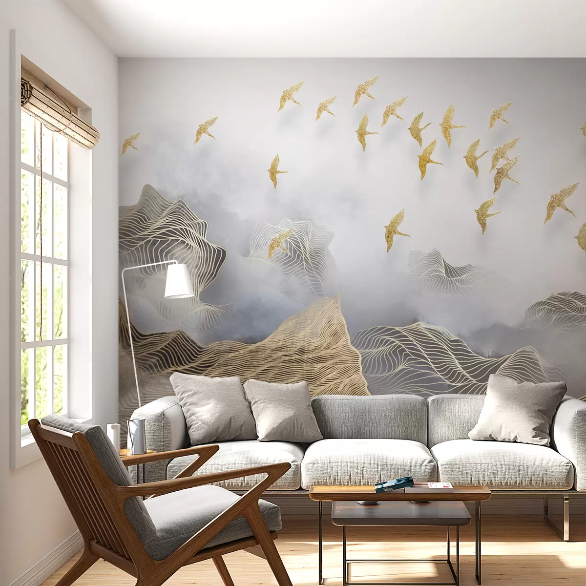 Τοιχογραφίες Ένα υπέροχο τοπίο με βουνά και πουλιά σχεδιάζεται από λεπτές γραμμές Nr. u44870