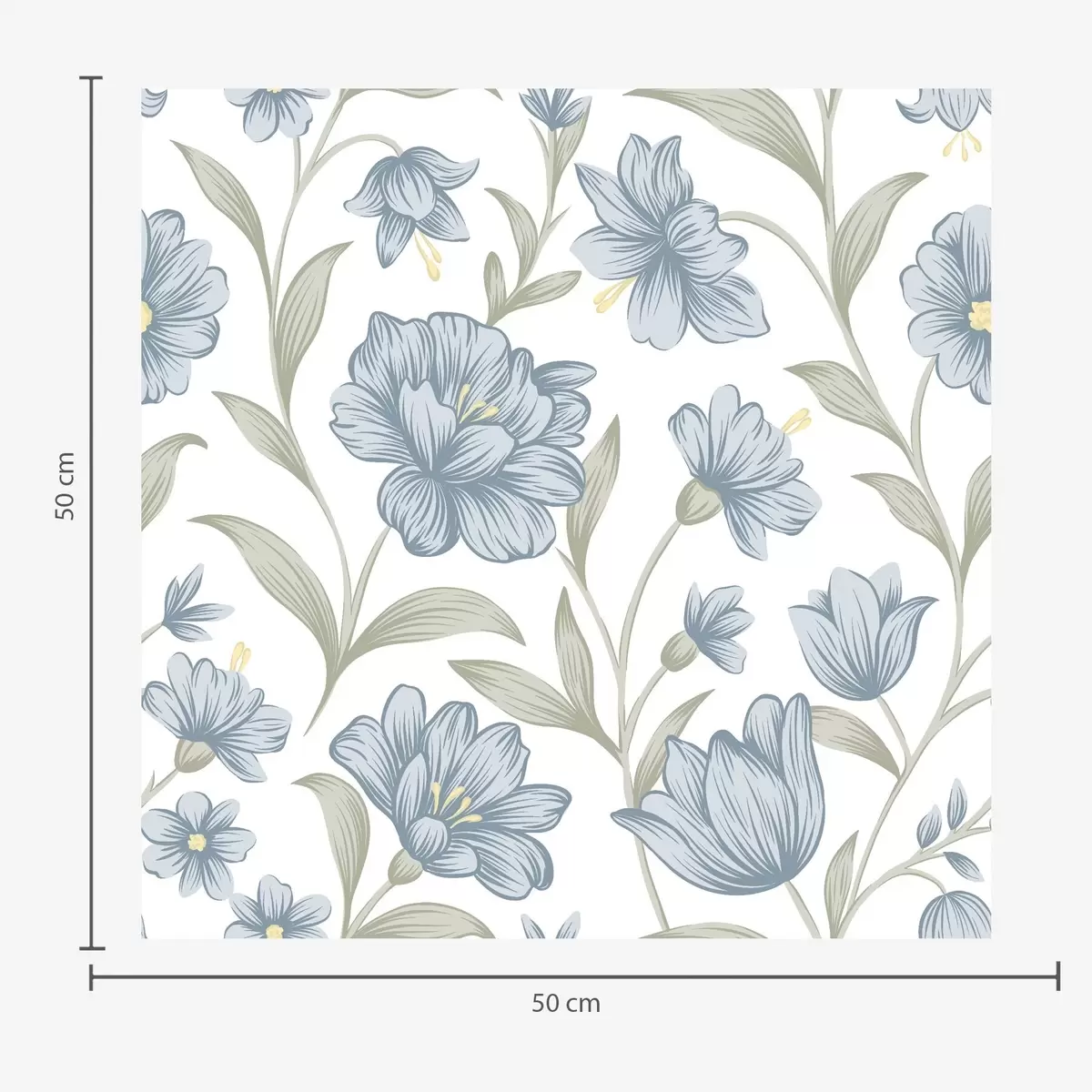 Ταπετσαρία Σκουριασμένα μπλε λουλούδια με φύλλα ελιάς σε λευκό φόντο Nr. a00780