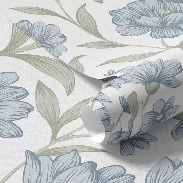 Ταπετσαρία Σκουριασμένα μπλε λουλούδια με φύλλα ελιάς σε λευκό φόντο a00780