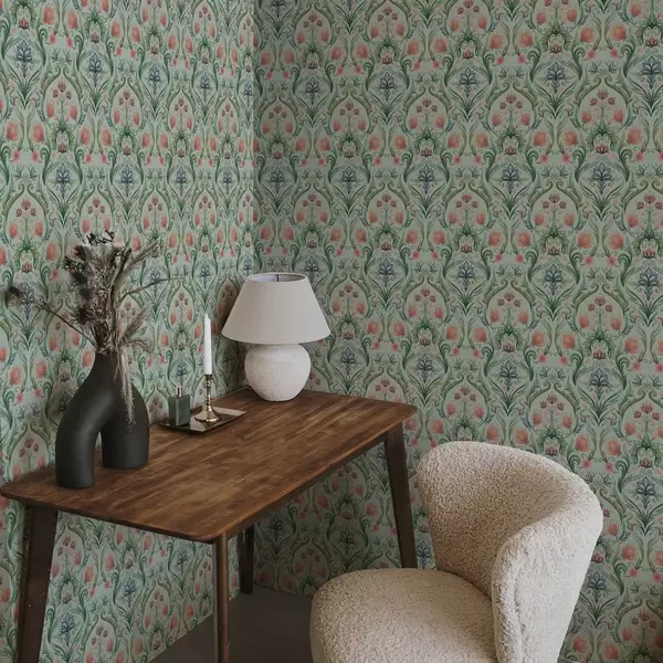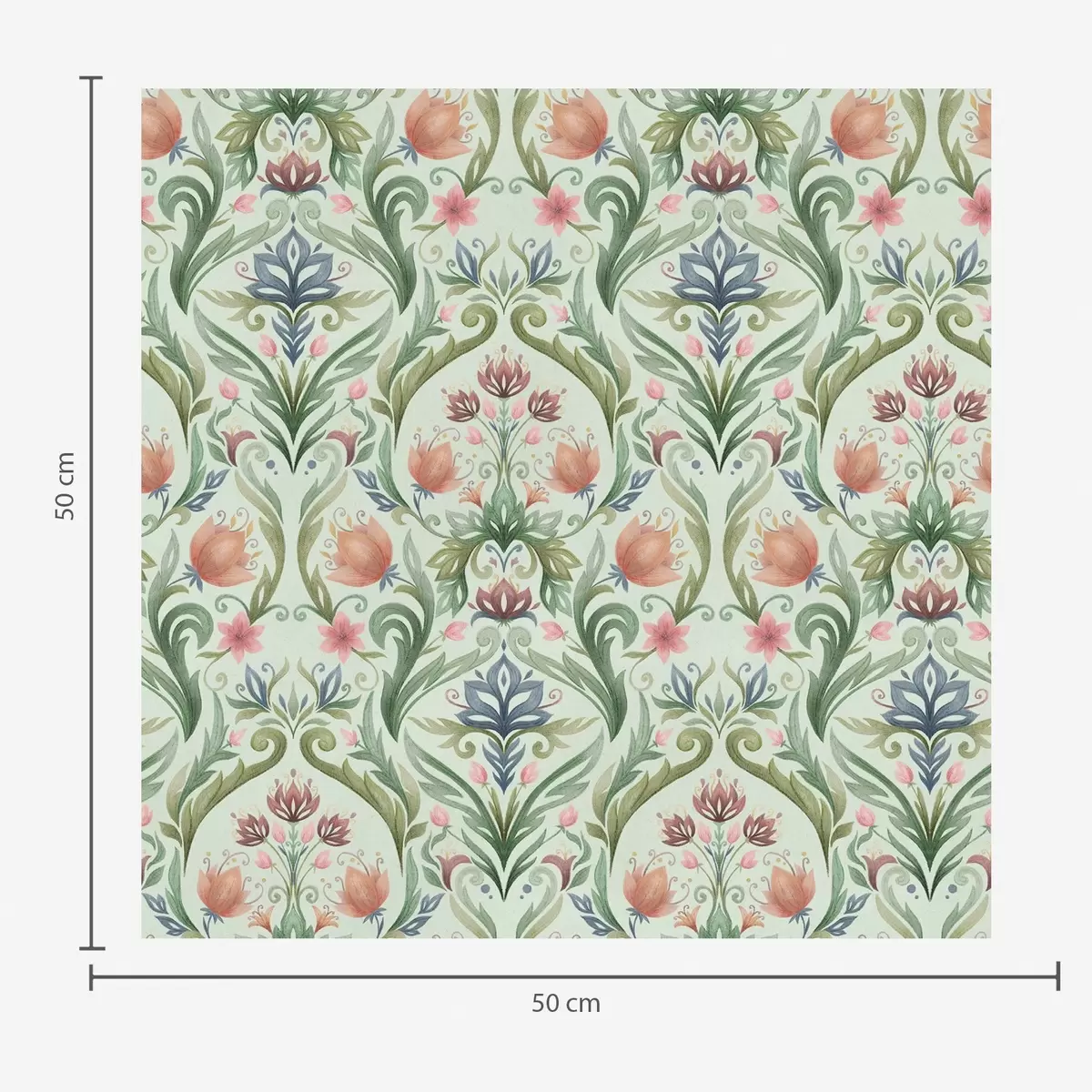 Ταπετσαρία Συμμετρικό floral μοτίβο, παλέτα χρωμάτων μέντας-κρέμας Nr. a00827v1
